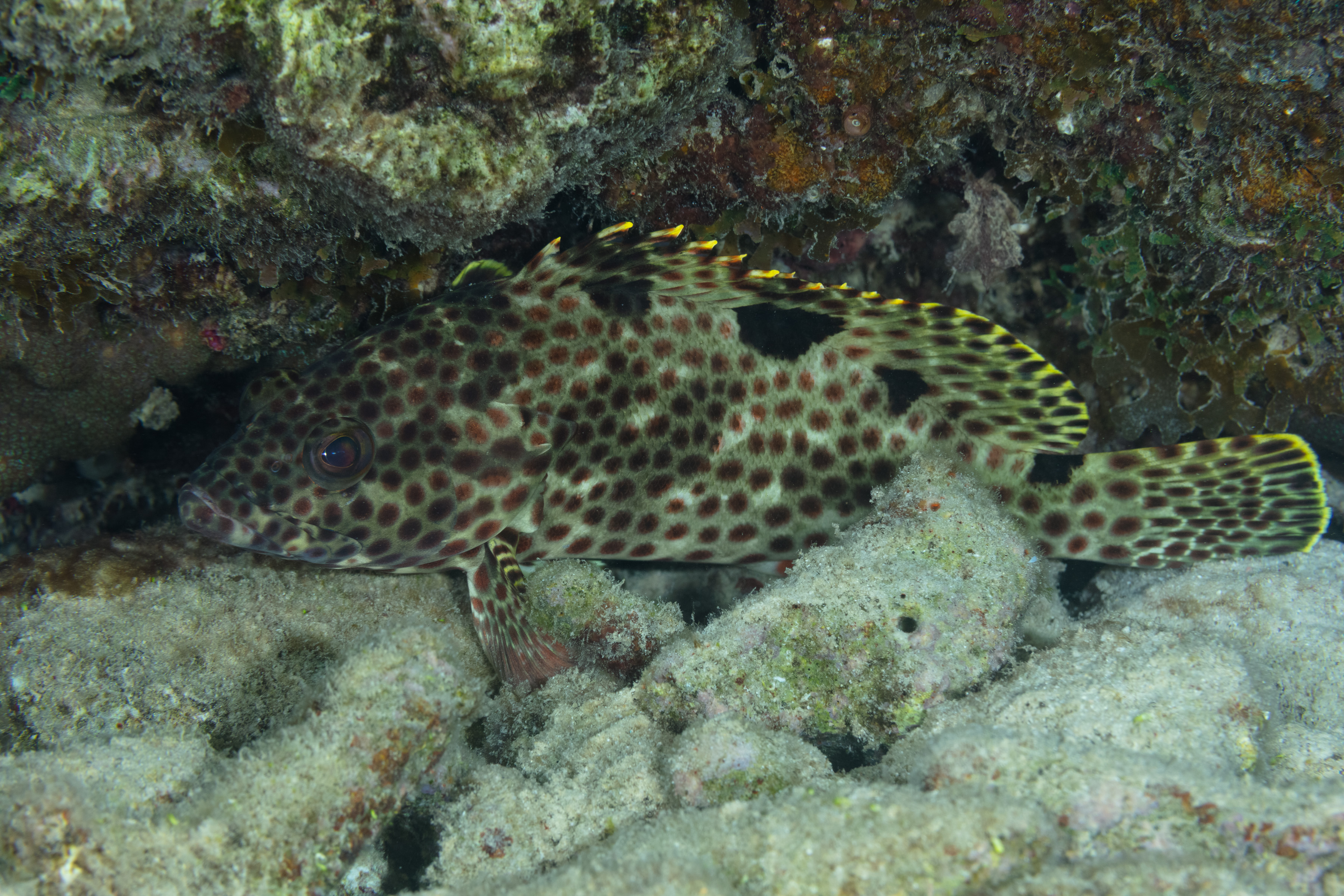 The Rock Hind is very shy and is often found alone, hiding under ledges or in crevices in shallow waters. It is an ambush predator, feeding on small crabs, shrimp, and other invertebrates that pass by its hiding spot. Like many other groupers, it is born female and has the ability to change to male.