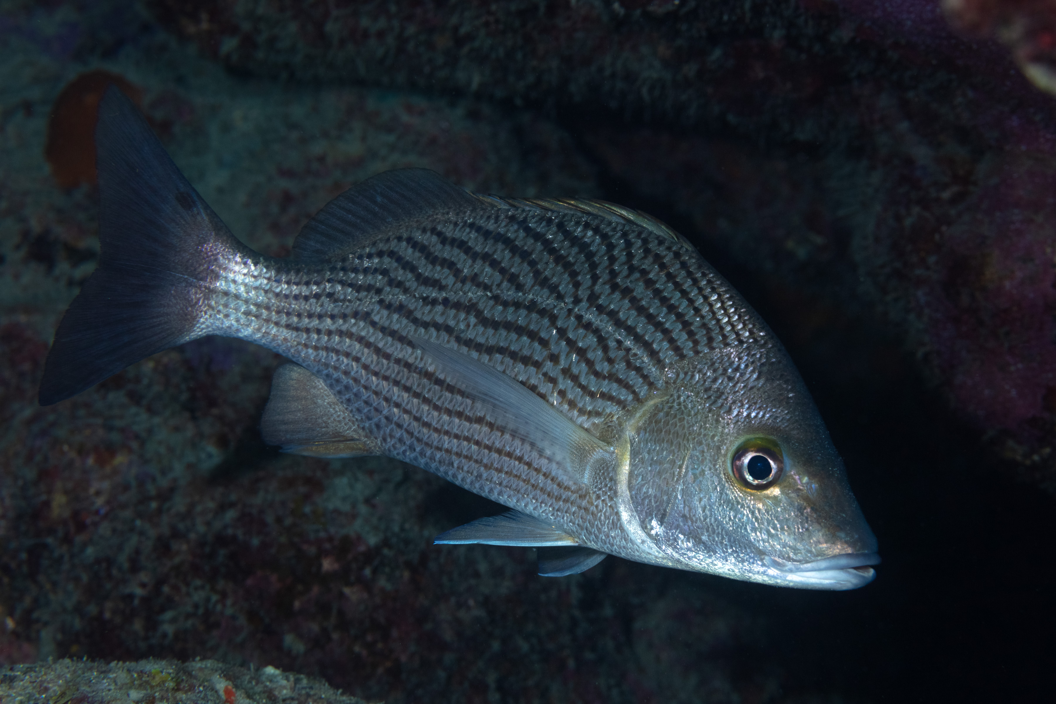 The Black Grunt has a silvery-gray body covered in dark lines formed by spots on its scales. Its large eye is sometimes surrounded by a golden tint, and it has a dusky tail. The dorsal, anal, and caudal fins are mostly dark, sometimes with a slight yellow tint.