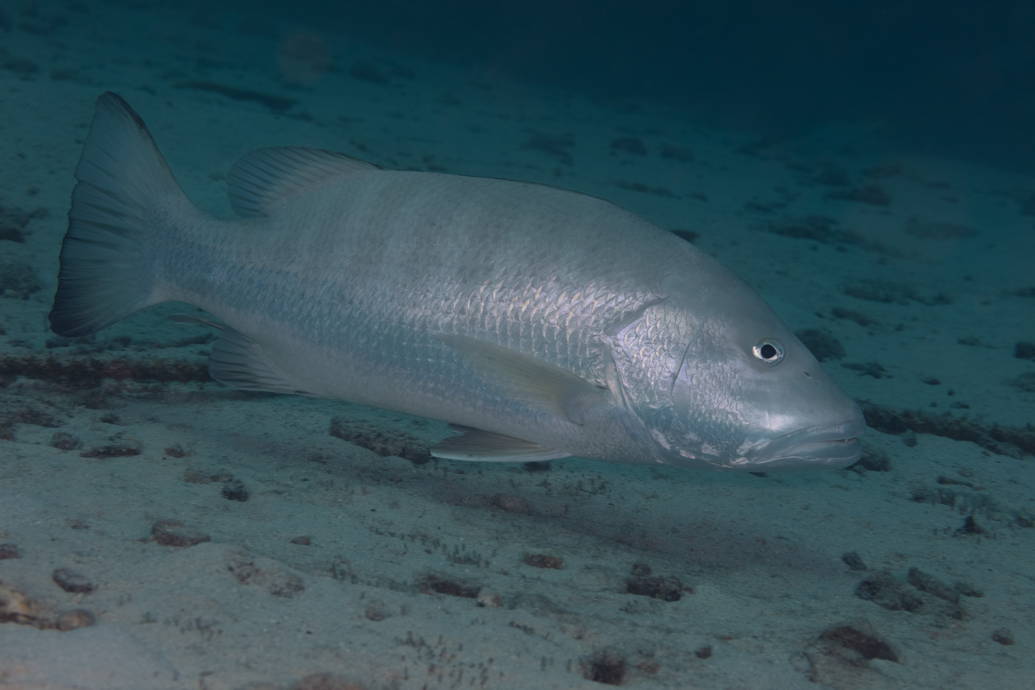 This big Snapper can be seen alone on the reef, under ledges, and at wrecks and piers. It is a cautious hunter and uses its strong canine teeth to catch fish, lobsters, crabs, and other crustaceans. Cubera Snapper gather in large spawning groups over deep reef slopes or sandy drop‑offs, often influenced by the lunar cycle. These spawning aggregations are predictable and make it vulnerable to overfishing. The Cubera Snapper can live a very long time, with some individuals reaching an age of more than 50 years.