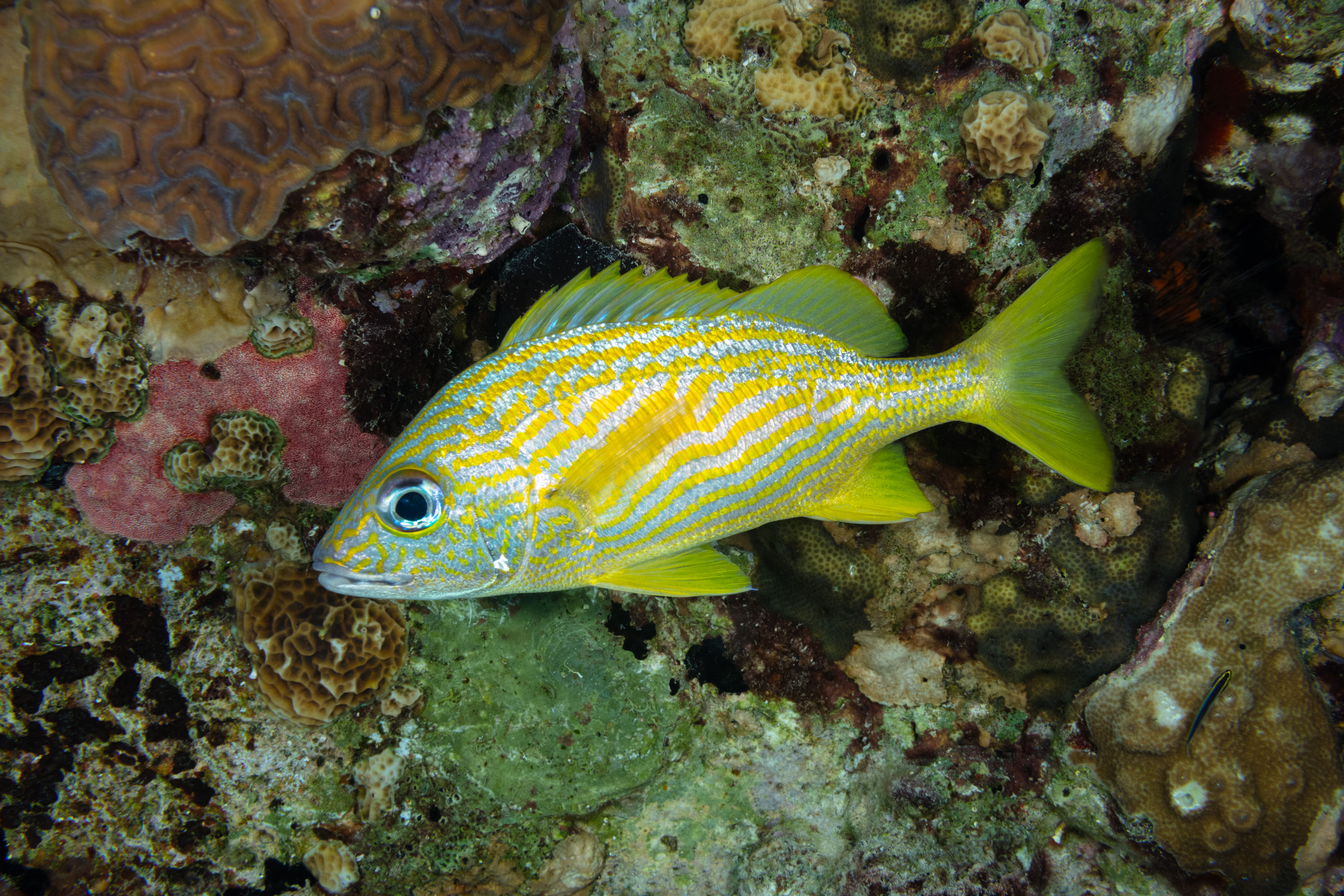 This Grunt is often found in large schools on the reef, near ledges, wrecks, and piers, and it is somewhat cautious. At night, it moves to sand flats and seagrass beds to feed on small crustaceans and other invertebrates. Juveniles, however, are known to feed during the day. Individuals sometimes push each other mouth-to-mouth, possibly as part of territorial behavior or social ranking. It also makes a grunting sound by grinding its teeth together, which helps them communicate when threatened.