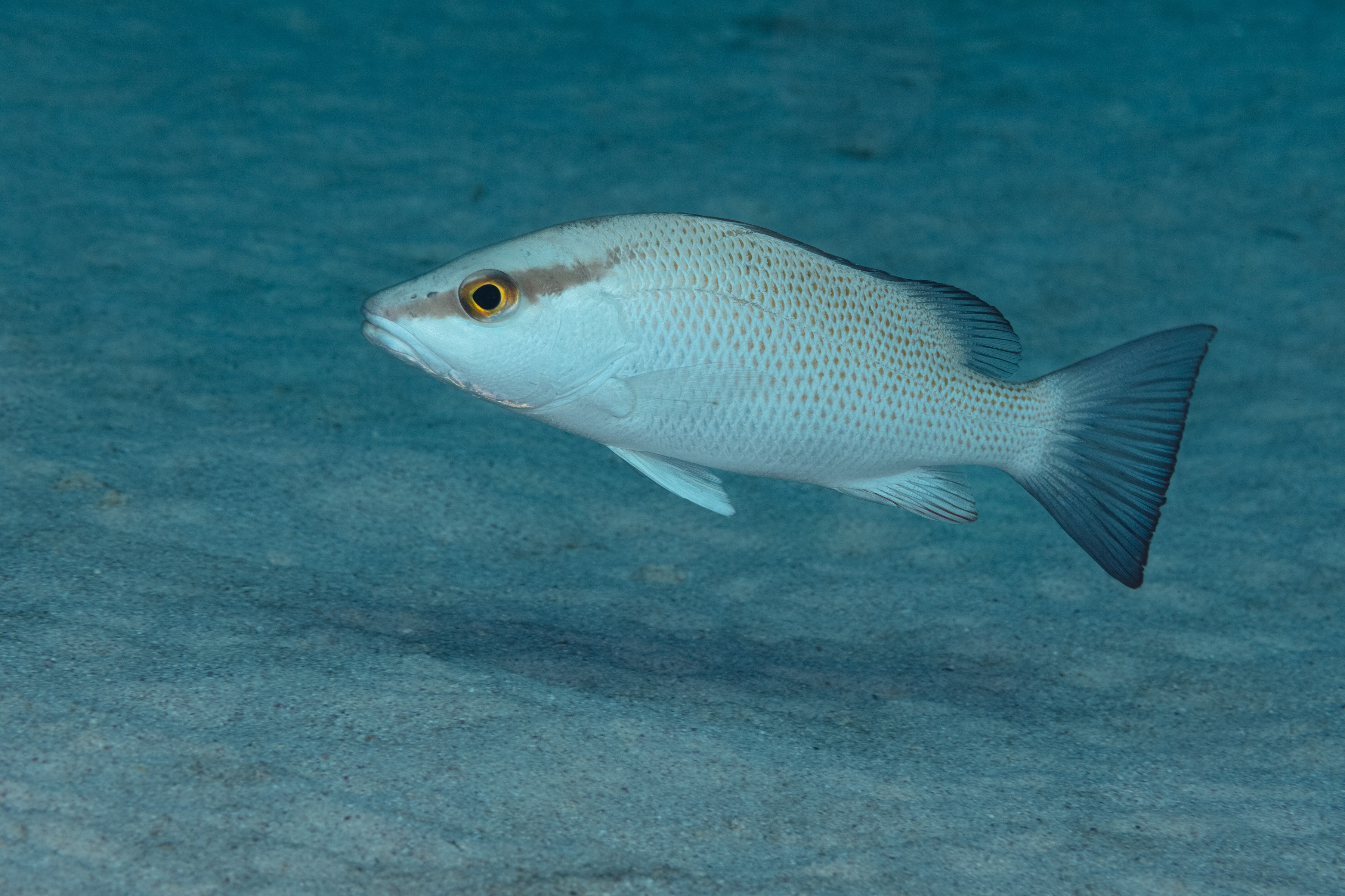 The Gray Snapper has a streamlined, compressed body that is typically gray, sometimes with a faint reddish tint. A broad dark bar may extend from the tip of the snout through the eye to the origin of the dorsal fin. The dorsal fin and tail may have a dark margin. Juveniles have a dark stripe that runs from the snout through the eye to the dorsal fin.