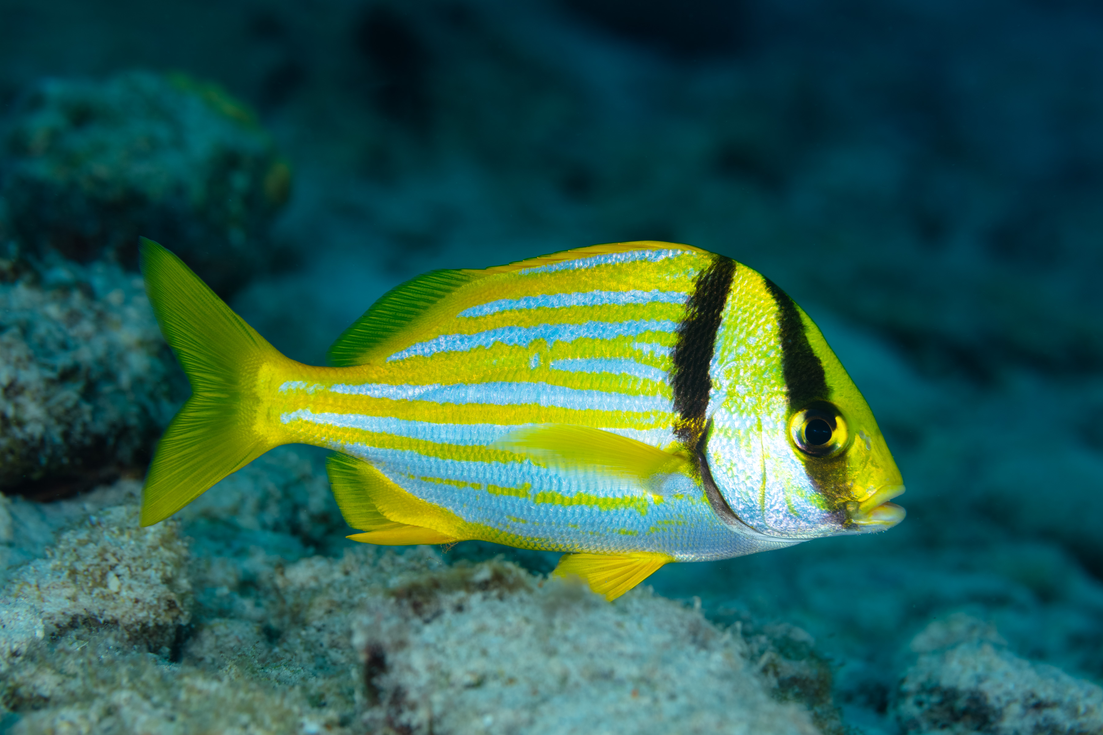 The Porkfish has a silvery-blue body with two bold black bands on its head. Yellow stripes run horizontally along its sides from behind the head to the tail, and all of its fins are yellow.
