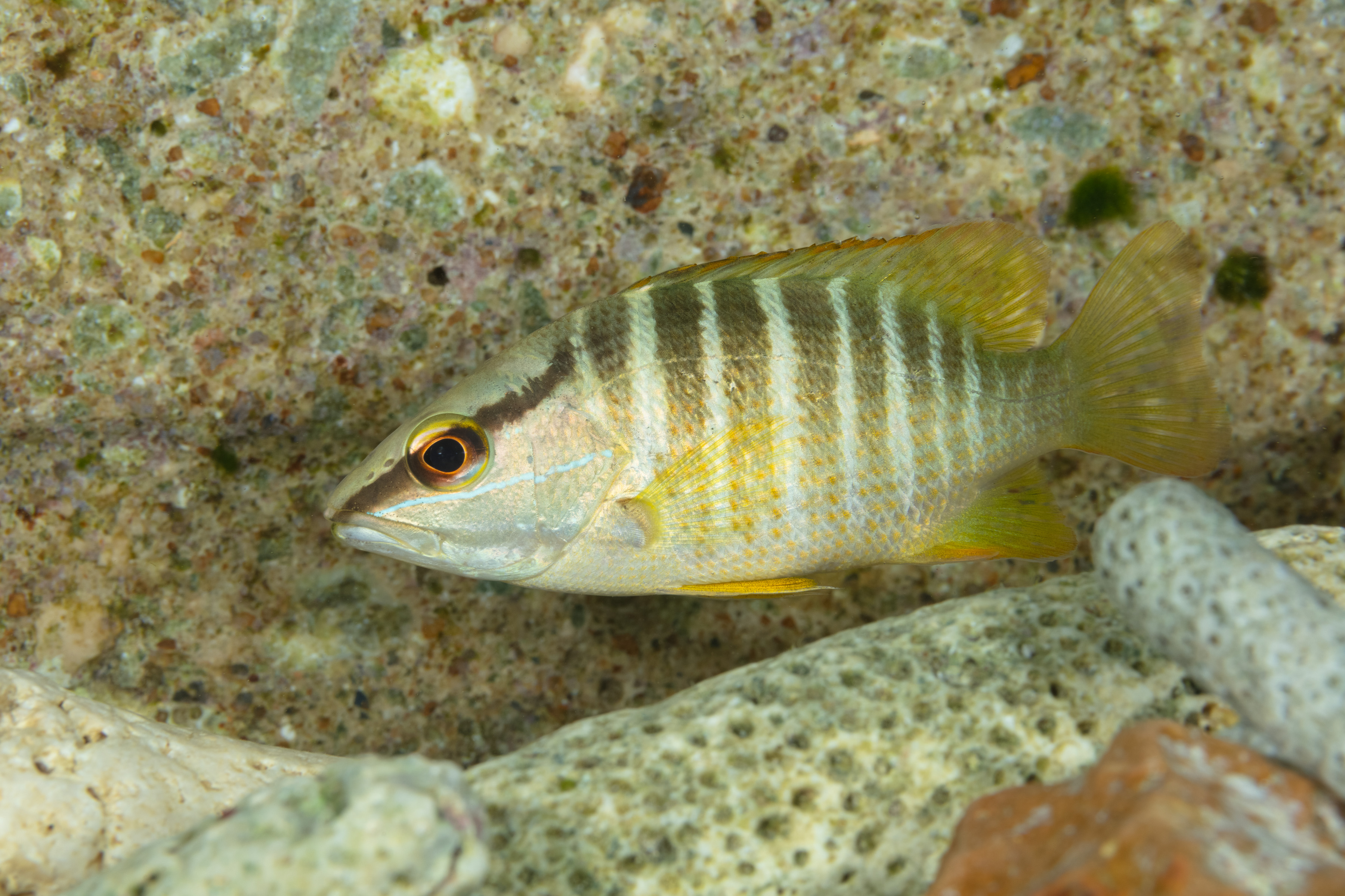 The Schoolmaster is often seen on Bonaire in small groups on the reef, resting during the day. Juveniles are usually found in shallow waters among mangroves and seagrass beds. Adults primarily feed at night, preying on small fish and crustaceans. As they grow, their diet shifts to include larger fish. Schoolmaster Snappers reproduce by spawning in open water, where males and females release eggs and sperm simultaneously.