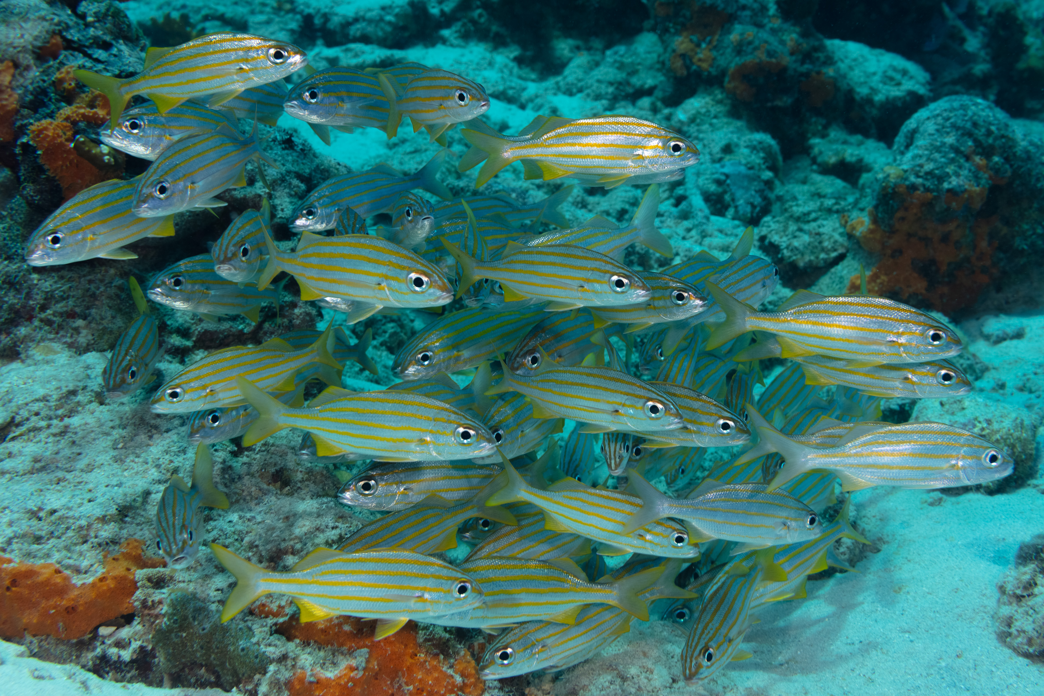 This Grunt is somewhat cautious and often seen in small schools on the reef, near ledges, wrecks, and in shallow waters. During the day, it often gathers in mixed-species schools, sometimes with other Grunt species or Yellow Goatfish. It feeds at night on small crustaceans and various other invertebrates, and is a common prey for larger predators. During breeding, it forms pairs and lays eggs that float in open water before hatching. It also makes a grunting sound by grinding its teeth together, a behavior common among many species in the Grunt family.