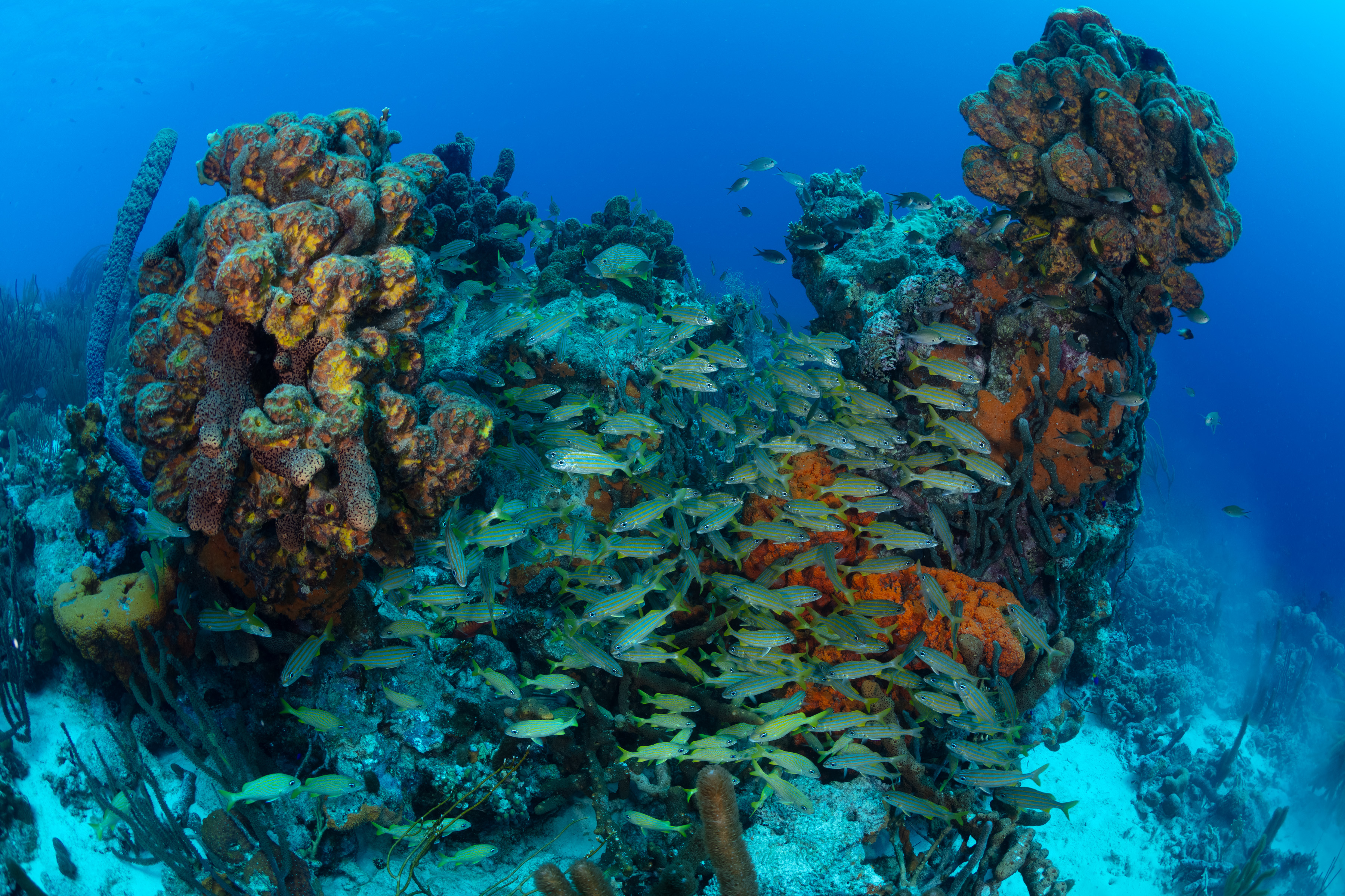 At the bottom of this photo, there are also some French Grunts in this group of Smallmouth Grunts.