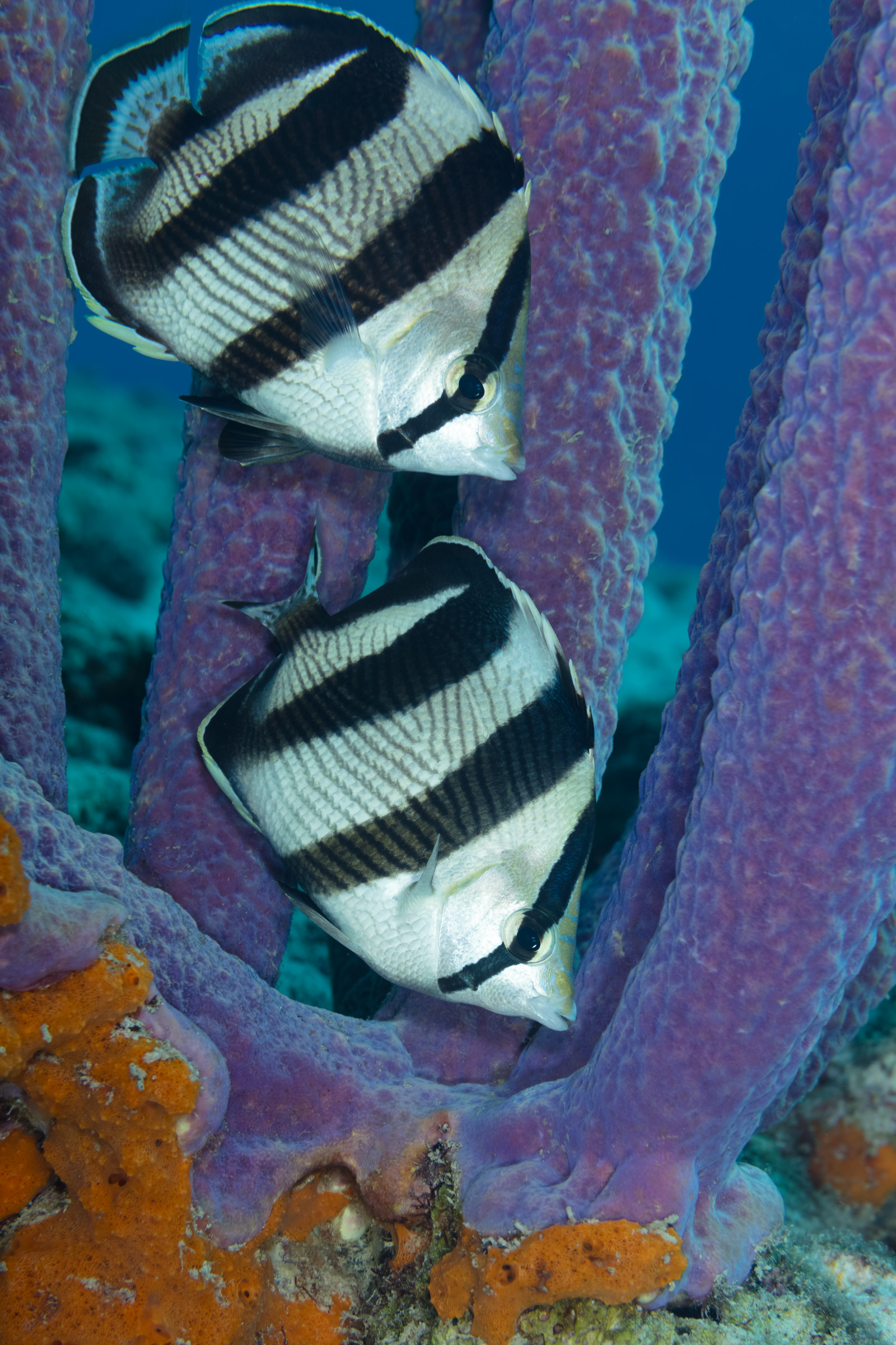 The Banded Butterflyfish has a silver-white body with a black bar that extends vertically through its eye. Two broad, black bands run along its sides, and another dark band is present on the rear of its body and tail. Juveniles have a distinct black spot with a white outline on the back part of their dorsal fin.