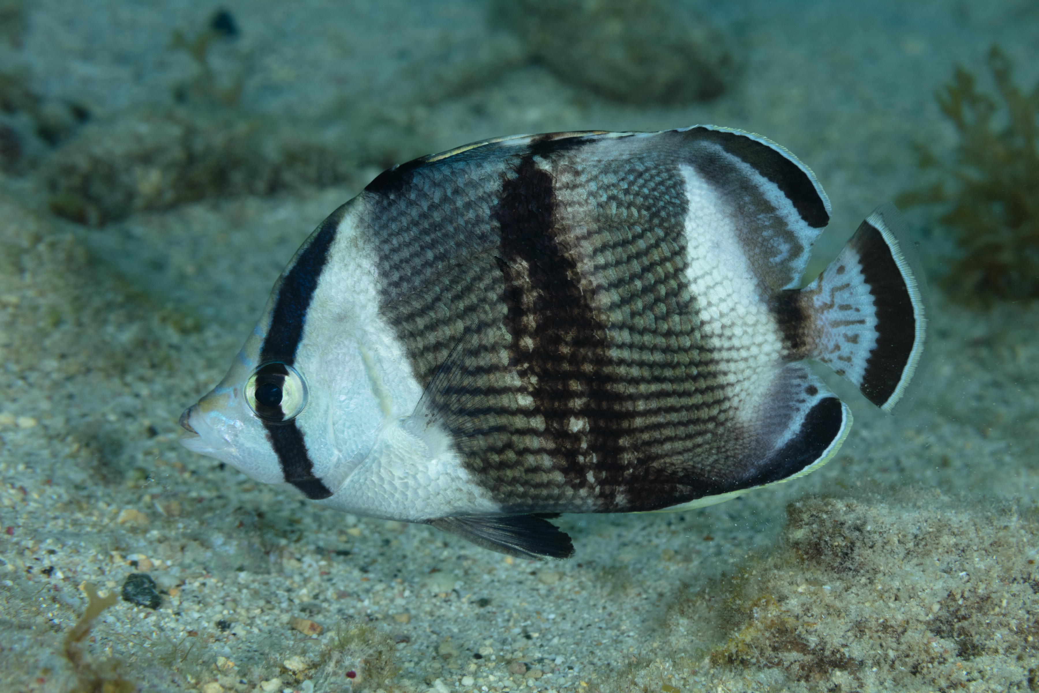 The Banded Butterflyfish has a silver-white body with a black bar that extends vertically through its eye. Two broad, black bands run along its sides, and another dark band is present on the rear of its body and tail. Juveniles have a distinct black spot with a white outline on the back part of their dorsal fin.