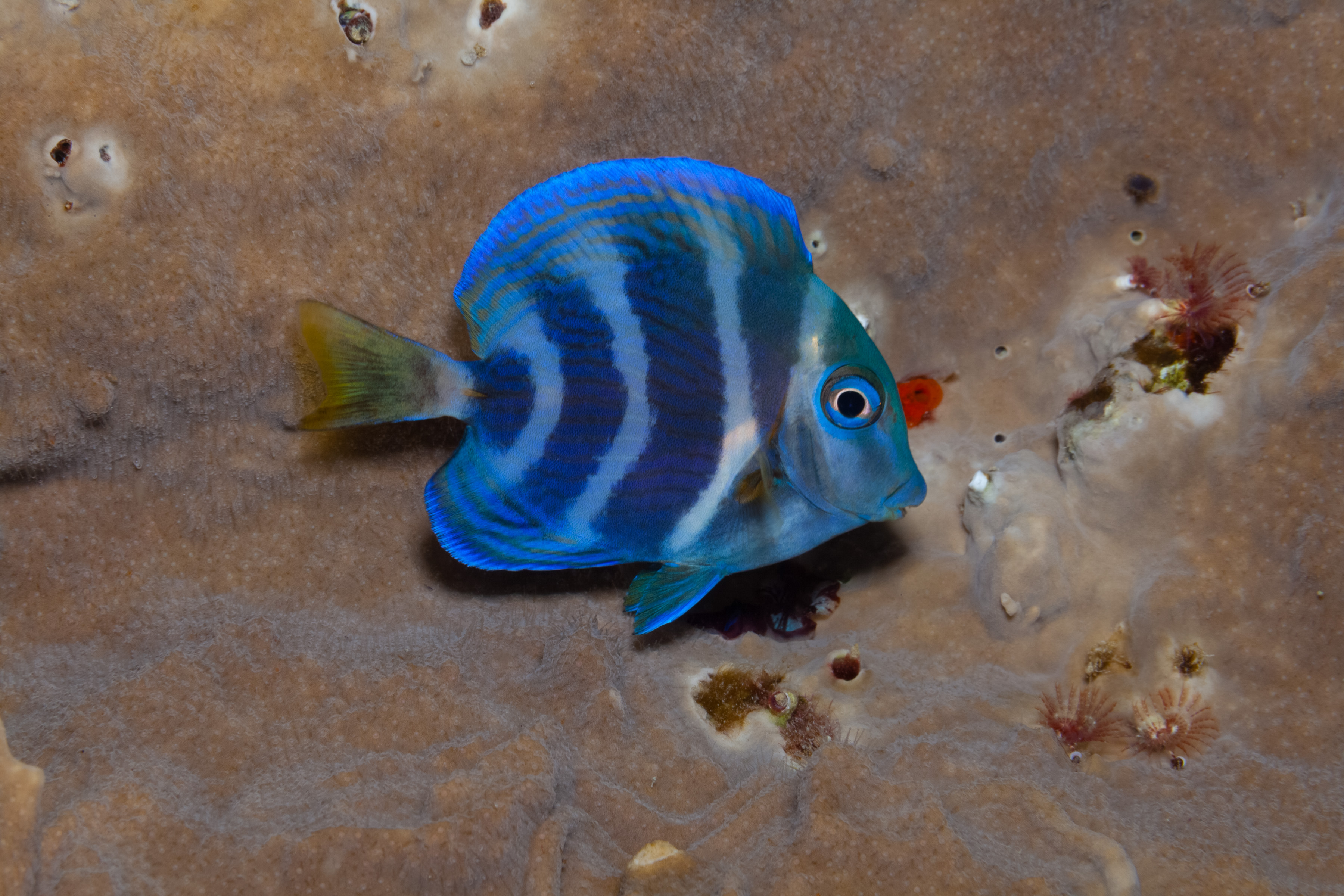 The Blue Tang eats algae, which helps prevent the algae from overgrowing and harming corals. It can be seen alone, but often gathers in large groups to feed on algae. These groups sometimes include other species, such as the Ocean Surgeonfish and Doctorfish. When threatened by predators, the Blue Tang may lie on its side and stay still to pretend to be dead. It reproduces by gathering in groups and releasing eggs and sperm into the water.