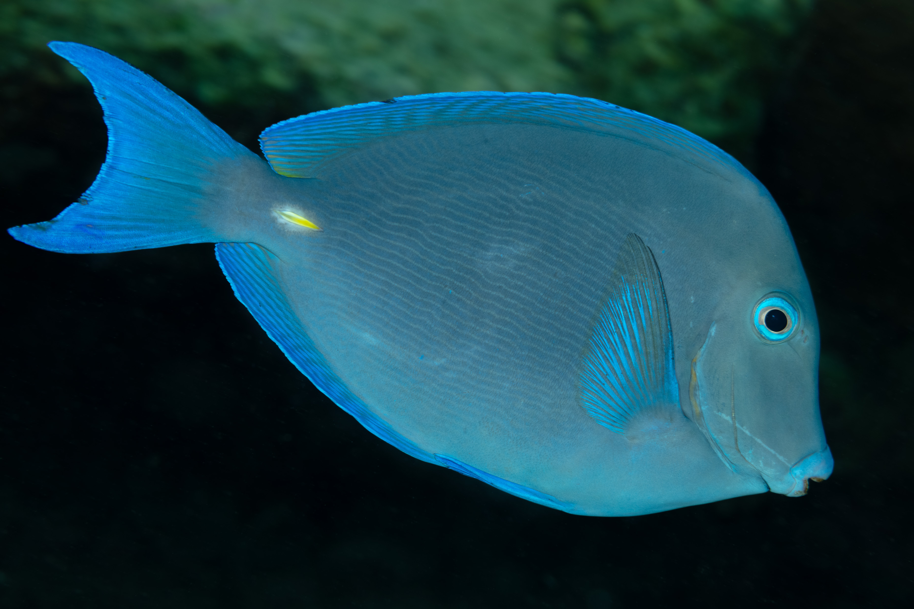 The Blue Tang has a bright blue flattened, oval-shaped body. A sharp, yellow spine is located on each side near the base of its tail. Its fins are also bright blue, and a vibrant blue line runs along the edges of its dorsal and anal fins. Juveniles are a bright yellow color, sometimes with faint dark bands on their bodies. In between these two stages, intermediates have a blue head and body that transitions into a yellow tail.