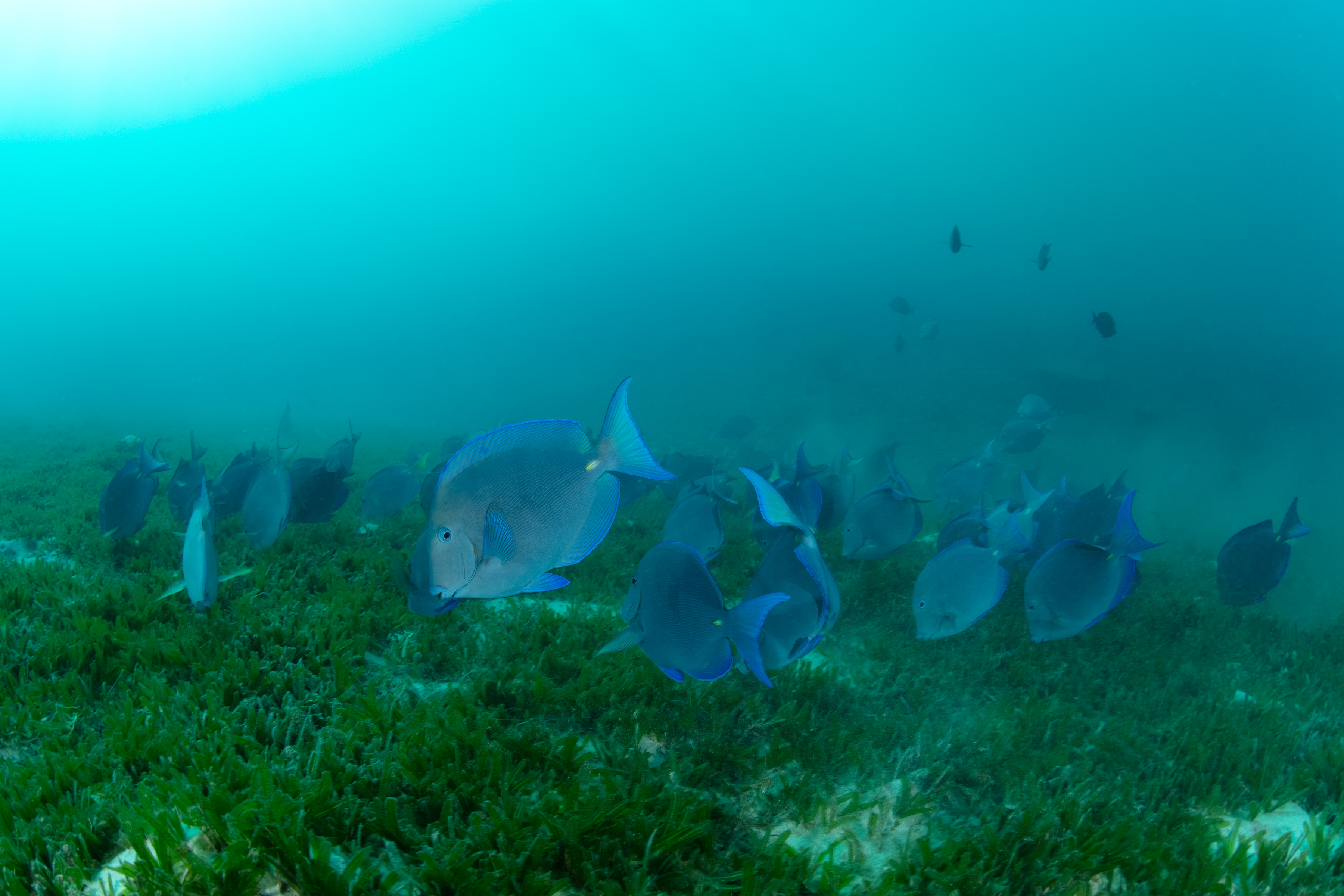 The Blue Tang eats algae, which helps prevent the algae from overgrowing and harming corals. It can be seen alone, but often gathers in large groups to feed on algae. These groups sometimes include other species, such as the Ocean Surgeonfish and Doctorfish. When threatened by predators, the Blue Tang may lie on its side and stay still to pretend to be dead. It reproduces by gathering in groups and releasing eggs and sperm into the water.