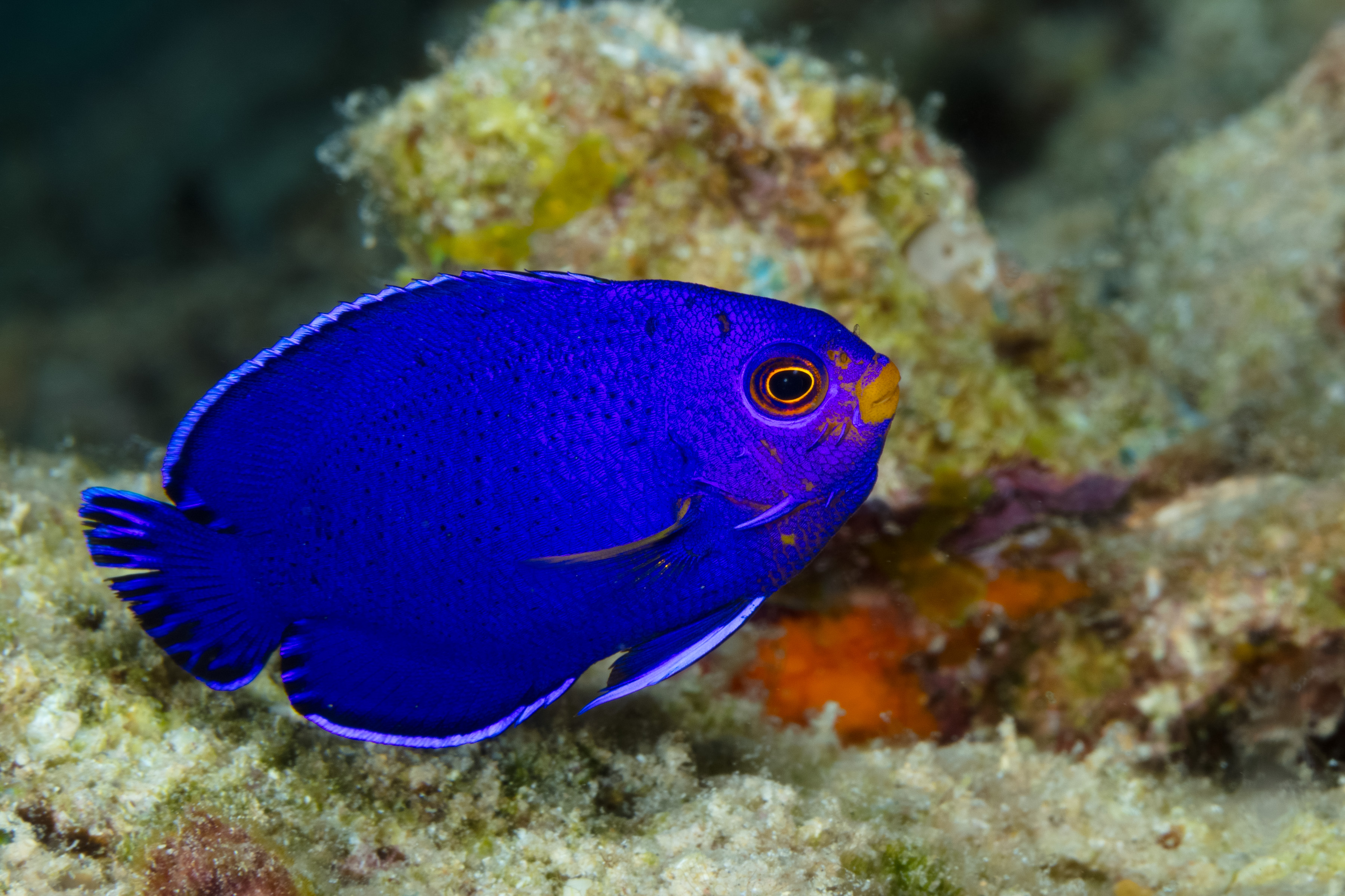 The Cherubfish is shy and usually lives in small groups in deeper waters, but in Bonaire, it can also be found in shallower areas. It tends to retreat into crevices and holes for safety when approached. It feeds on various types of algae and tiny invertebrates found on coral rubble. Like many other small angelfishes, Cherubfish are all born female, and the largest, most dominant individual in a group can become male. They live in small groups typically consisting of one male with multiple females and juveniles.