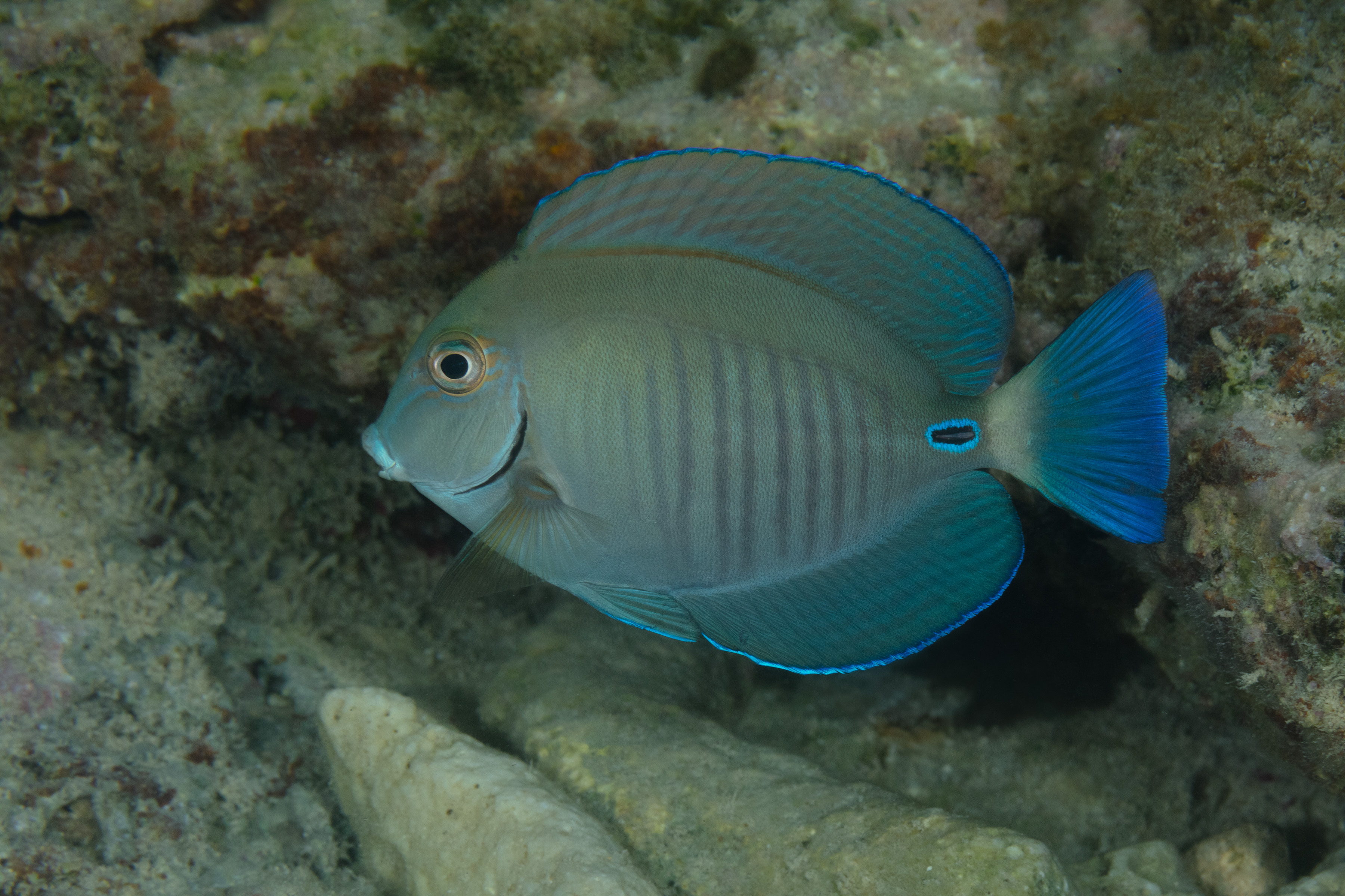 The Doctorfish has an oval-shaped, bluish-gray or dark brown body with about ten faint, dark bars along its sides. Several thin lines extend outward from the eye. Its fins are the same color as its body but have blue edges, and the end of the tail is a lighter blue. The sharp, blade‑like spine at the tail base resembles a surgeon’s scalpel and is often encircled by a striking blue ring. Juveniles have a faint white band at the base of the tail, just in front of the spine.