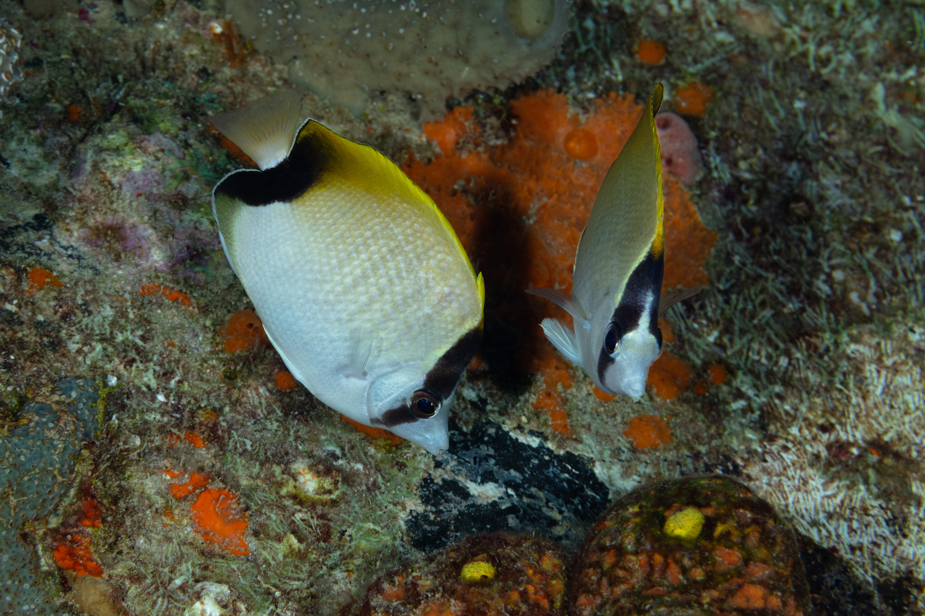 The Reef Butterflyfish is usually seen in monogamous pairs and is very cautious. The pair swims together in a synchronized courtship at dusk before releasing thousands of small, floating eggs. They feed during the day, using their small mouths and slender teeth to eat small invertebrates like worms and shrimp hiding in coral crevices. They are also known to eat the eggs of other species, like Sergeant Majors.