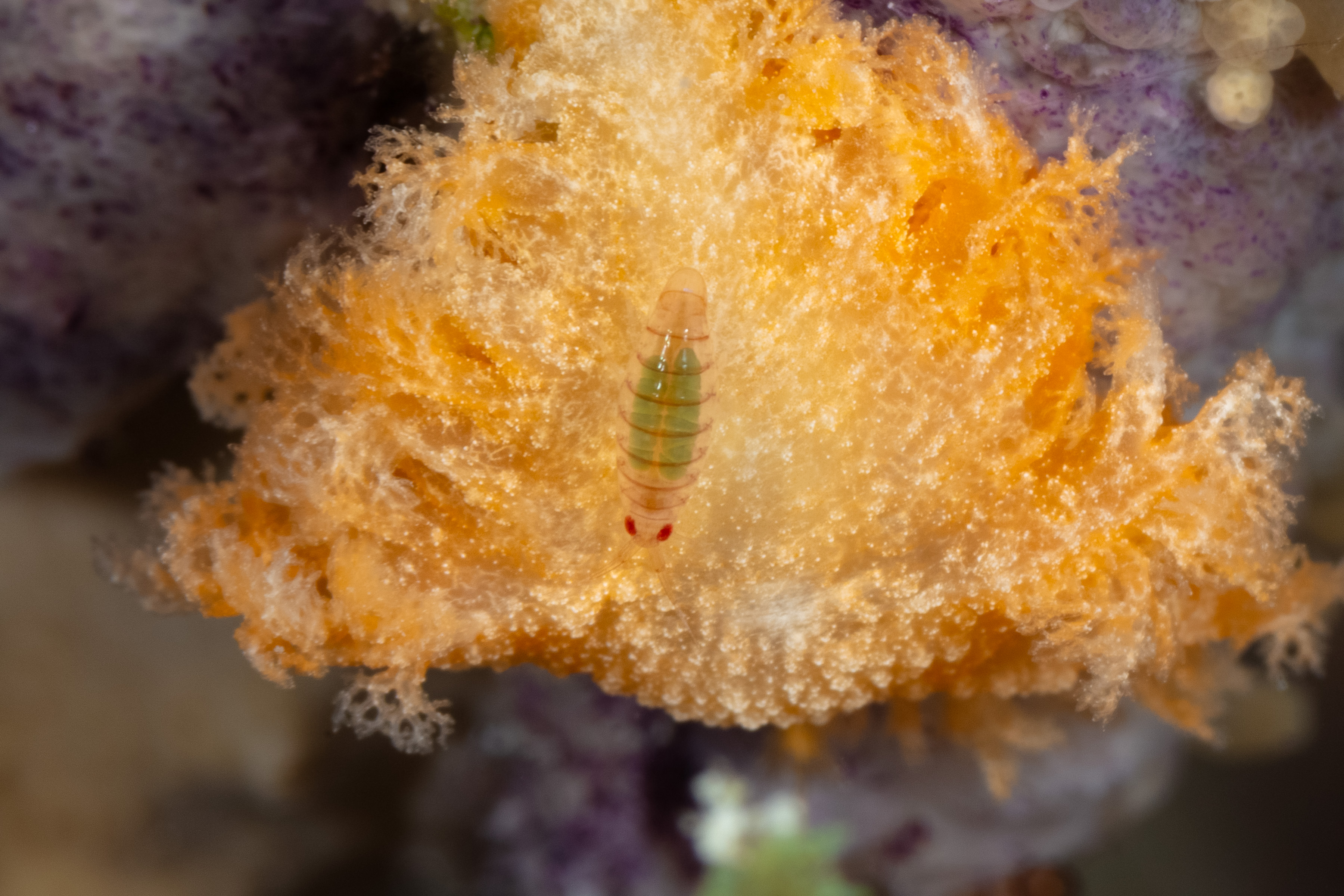 In this photo, the Flea Shrimp is sitting on a Tufted Nudibranch.