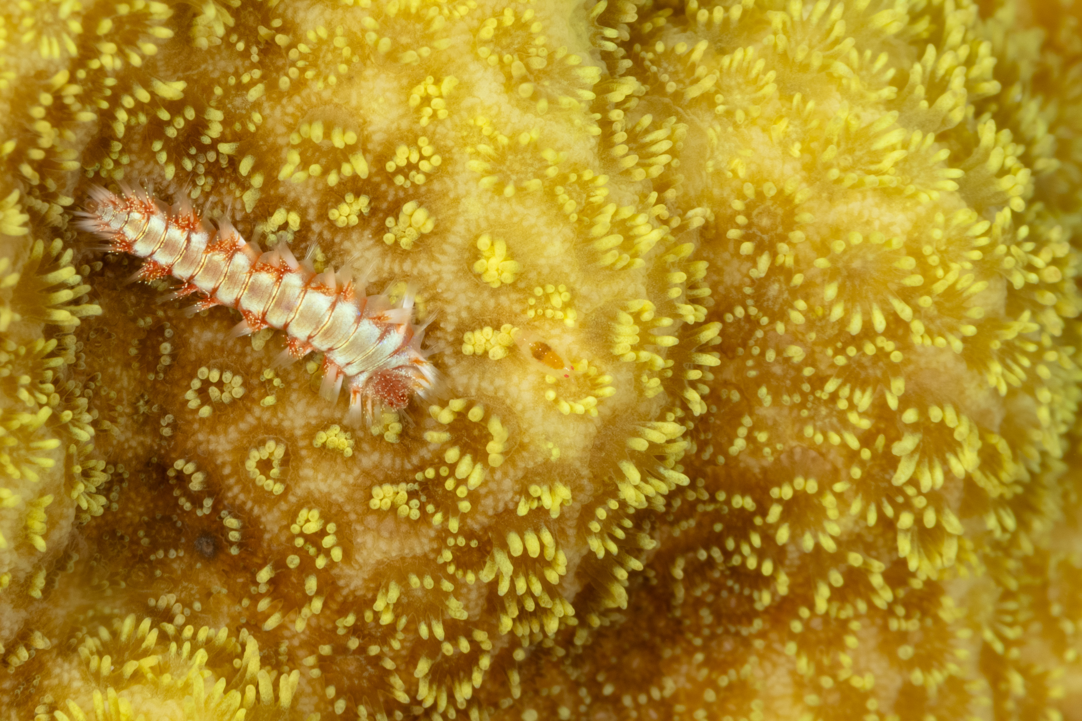 In this photo the tiny Flea Shrimp is in the center of the photo, just to the right of the Fireworm.