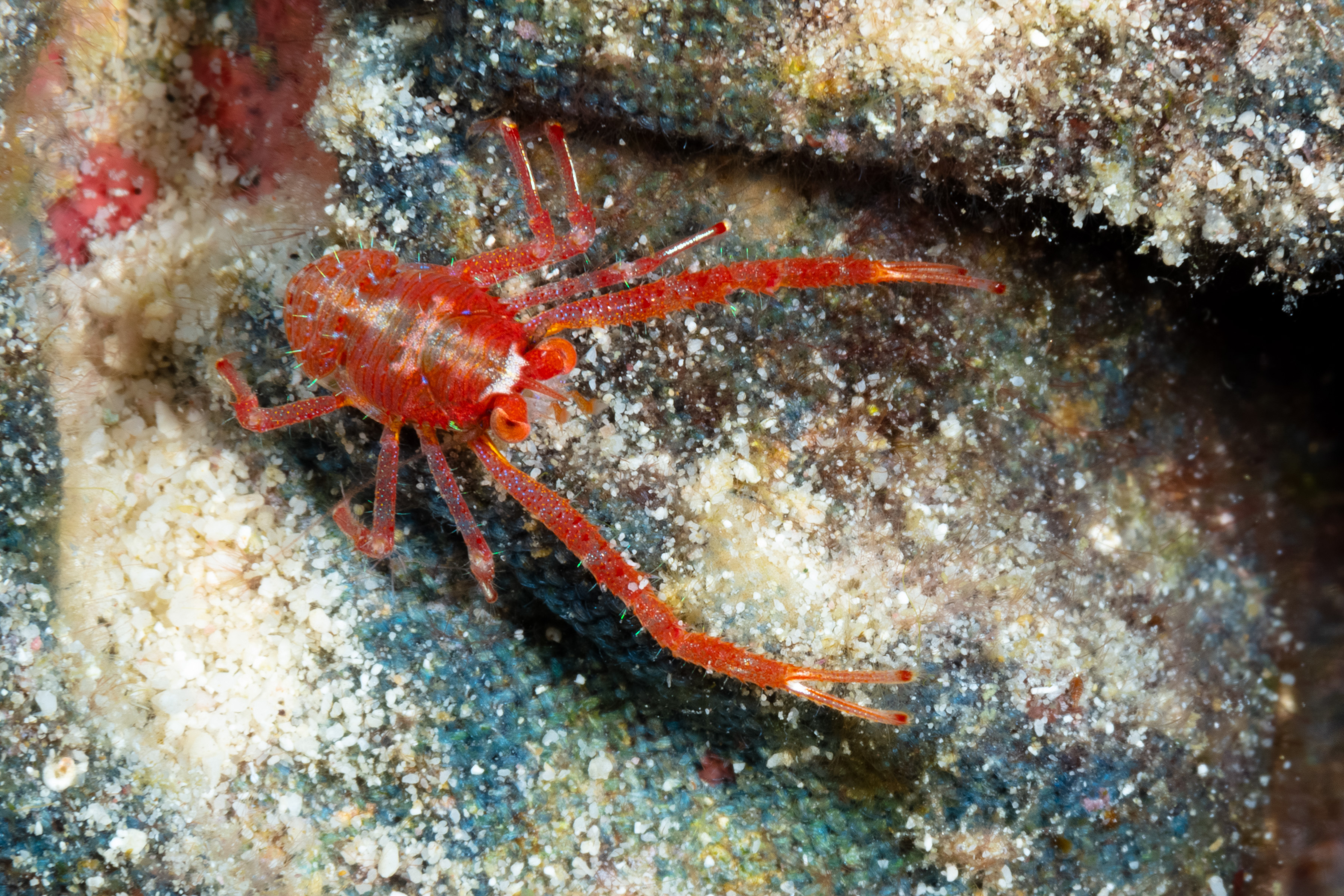 This Squat Lobster has a red to dark red body, occasionally marked with a pale stripe, and very long claw arms.