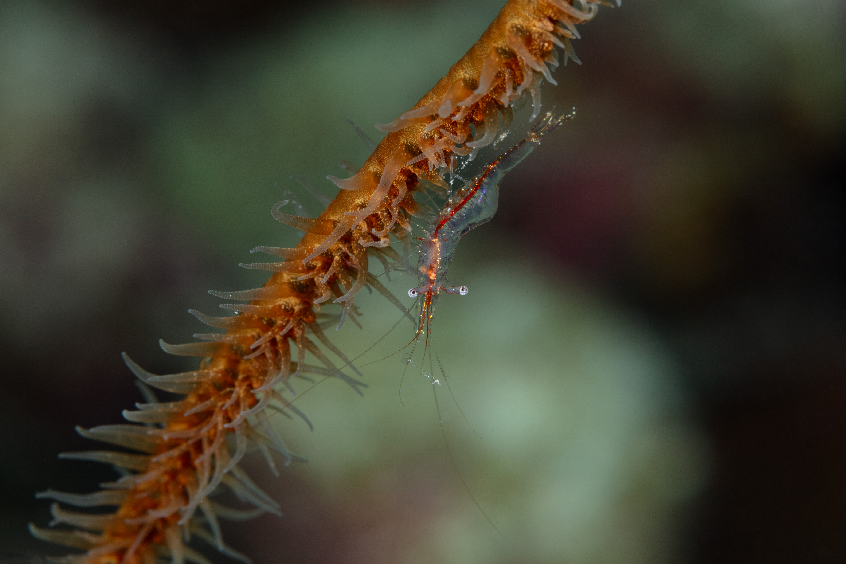 This Shrimp has a transparent body with a vivid red stripe and pale yellow spots. Its eyes are widely spaced on long stalks.