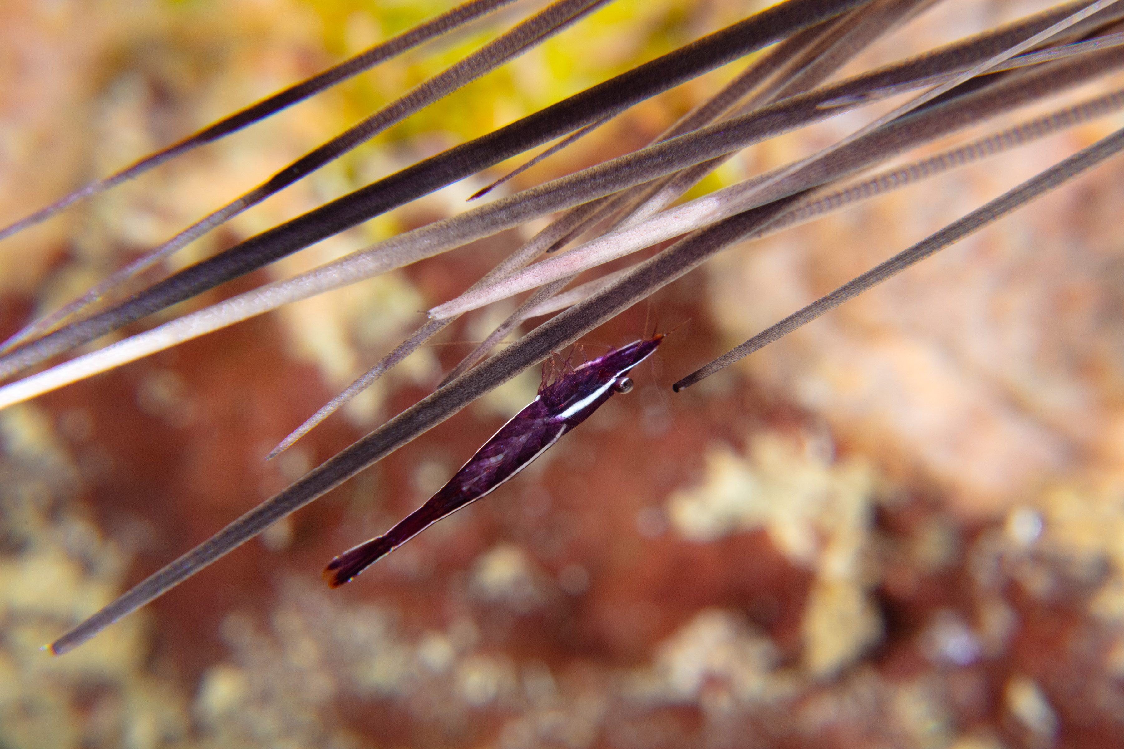 The Black Urchin Shrimp is found on the spines of Long-spined Urchins, positioning its head toward the base of the urchin.