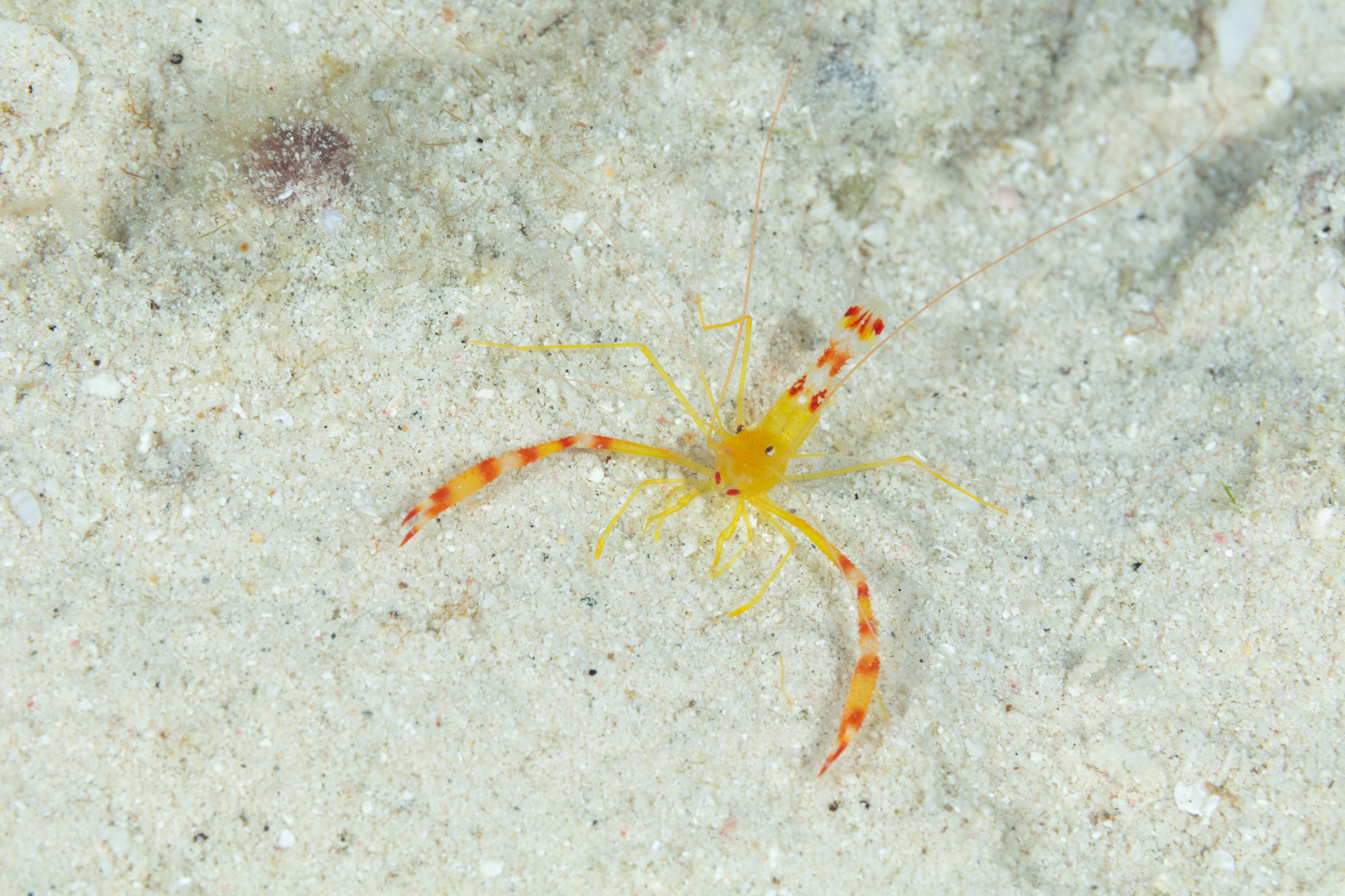 This Shrimp has a translucent yellow-gold body with red and white bands on its back and claws, along with two pairs of long white antennae.