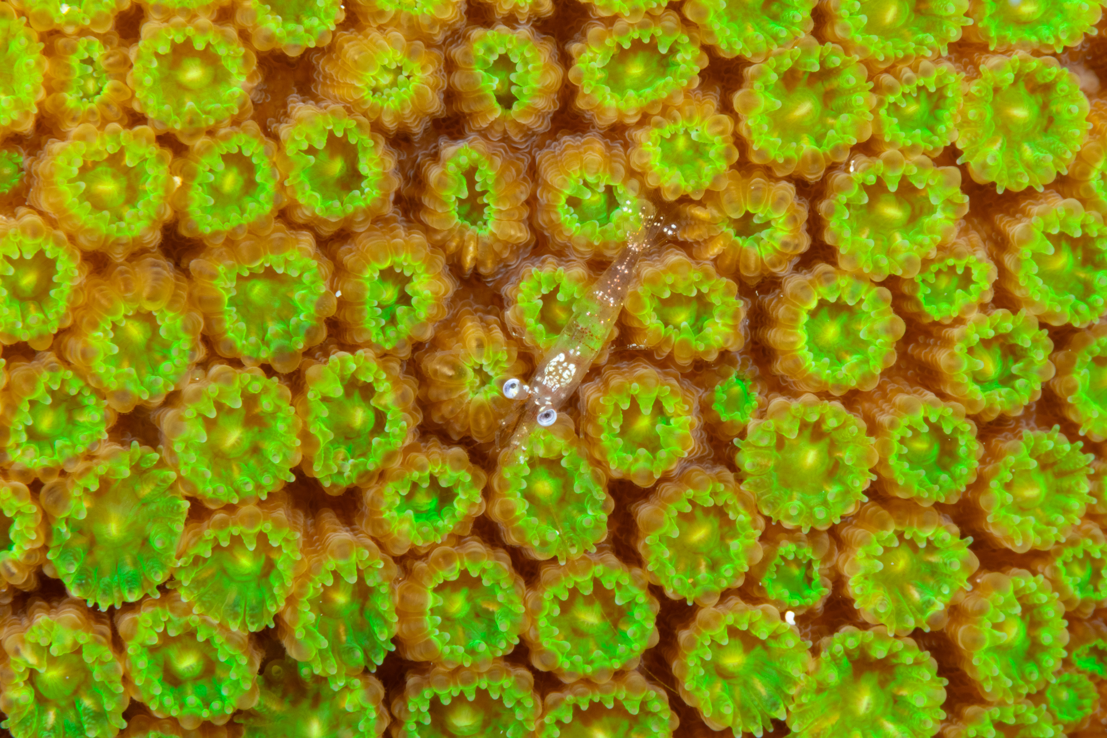 These tiny Shrimp have a translucent or pale body with red highlights and large eyes.