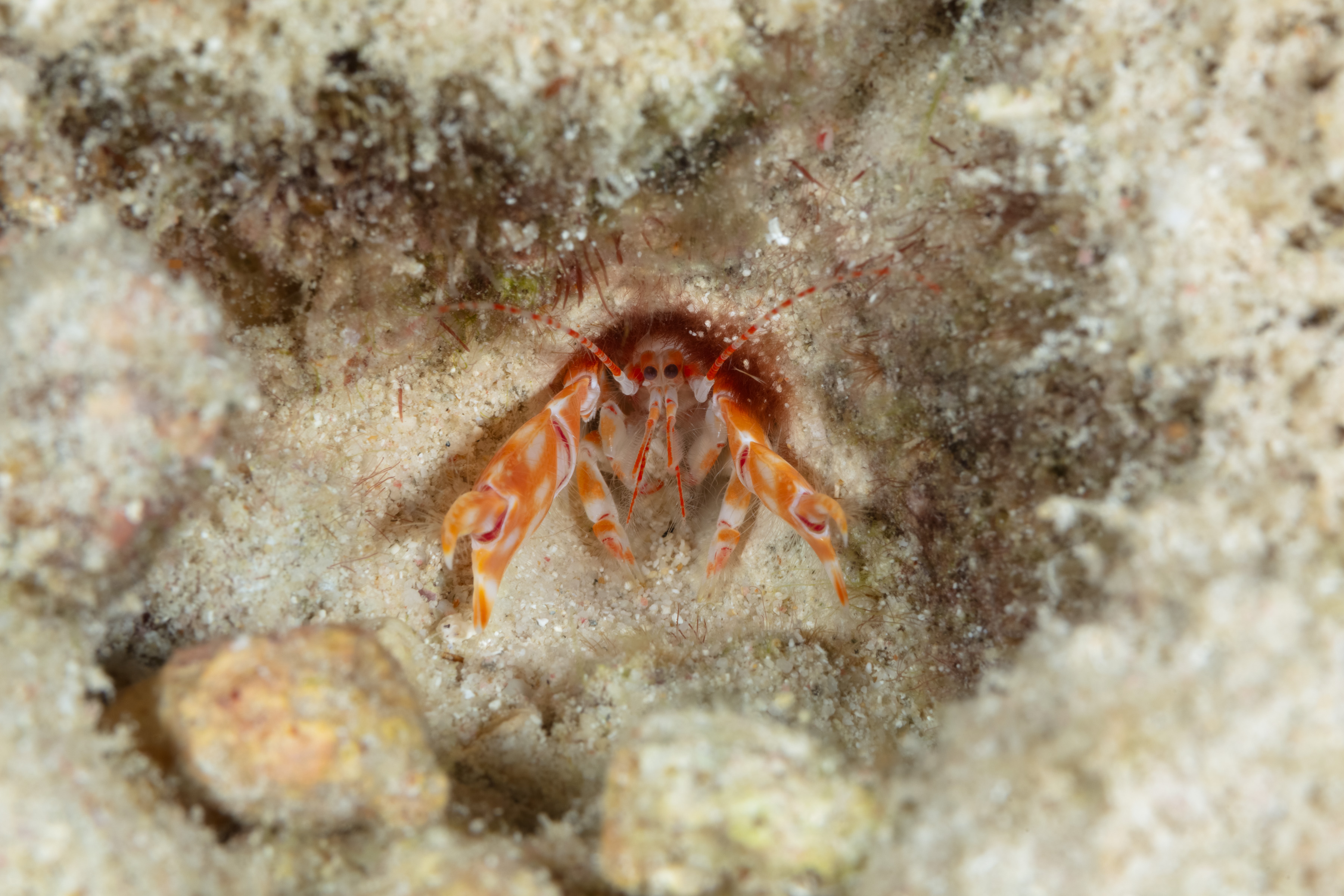 The Red-Orange Ghost Shrimp is often found hiding in burrows in the sand.