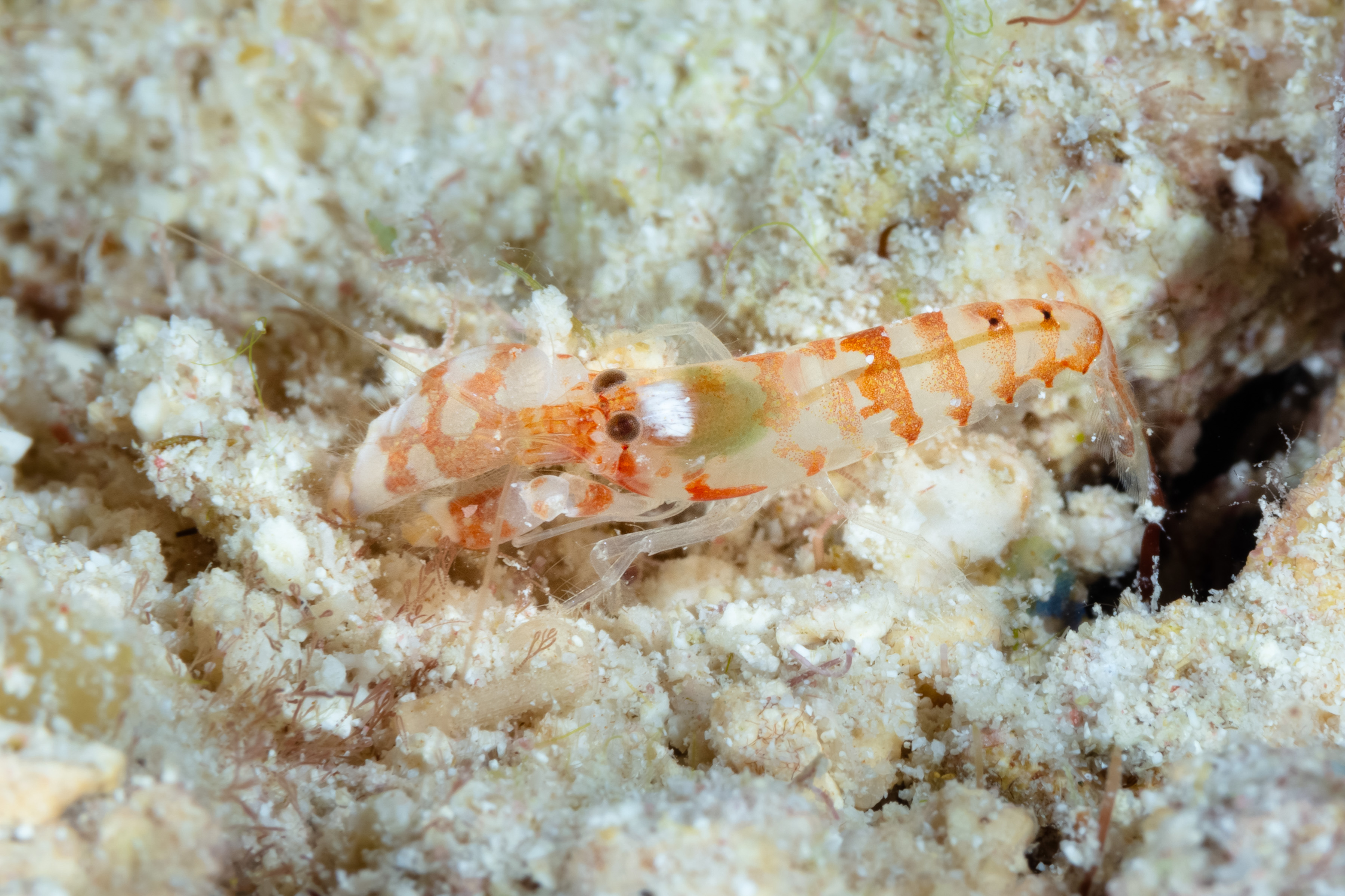 This Snapping Shrimp has a translucent, pale body with red bands on its back.