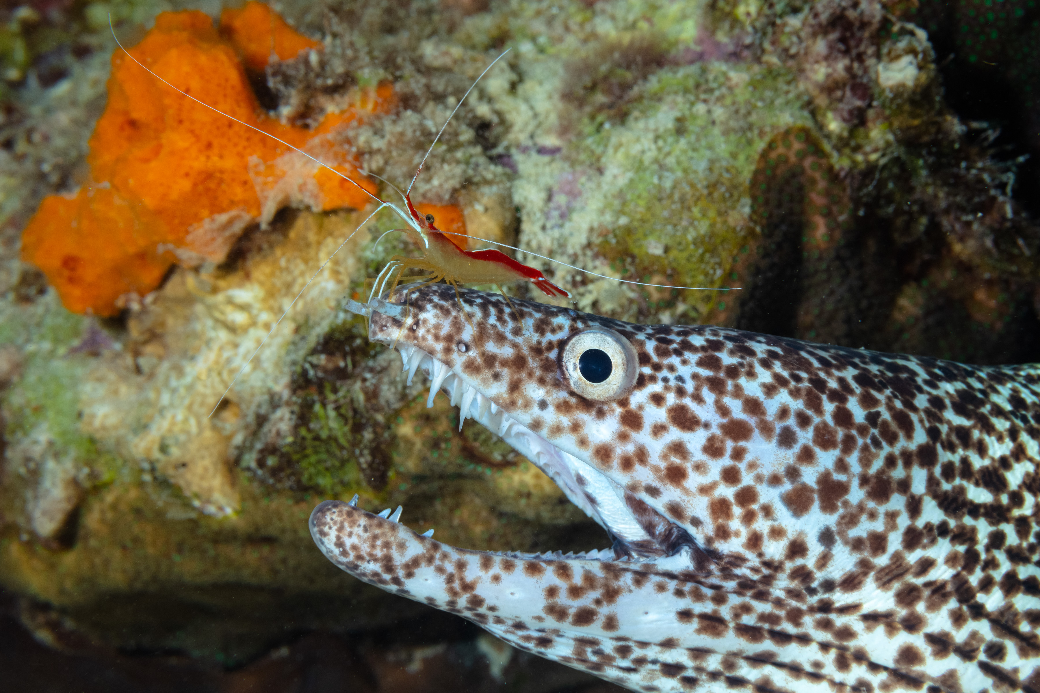 Scarlet-Striped Cleaner Shrimp on a Spotted Moray