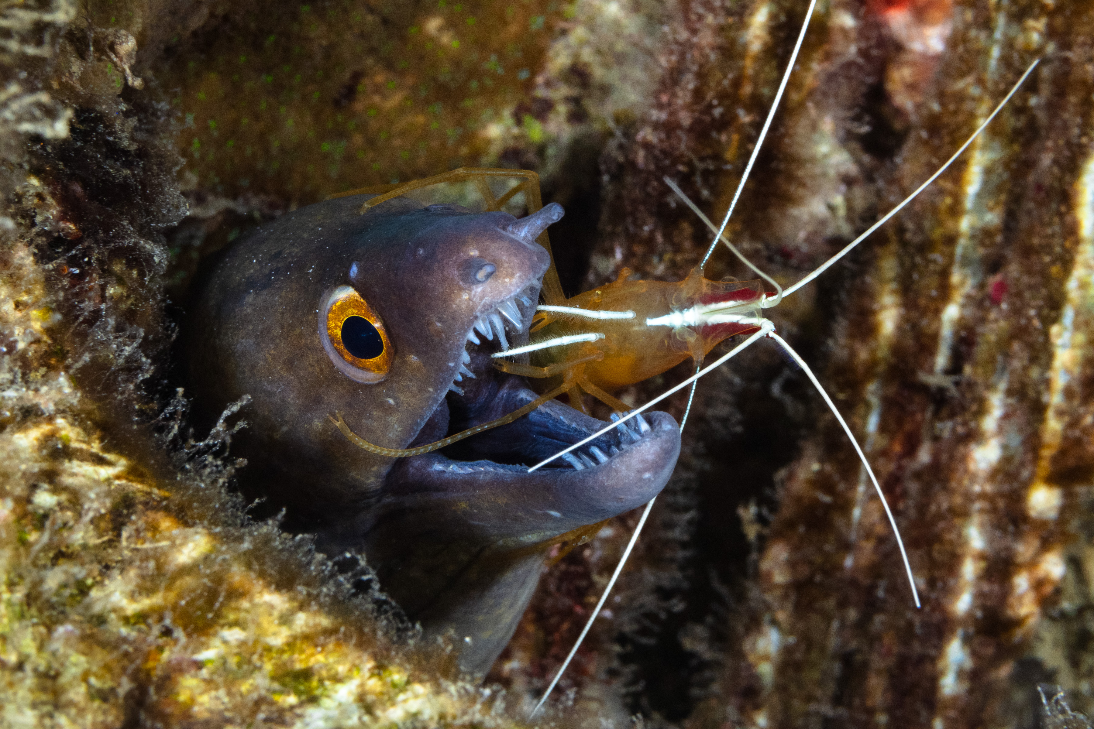 Scarlet-Striped Cleaner Shrimp cleaning a Purplemouth Moray