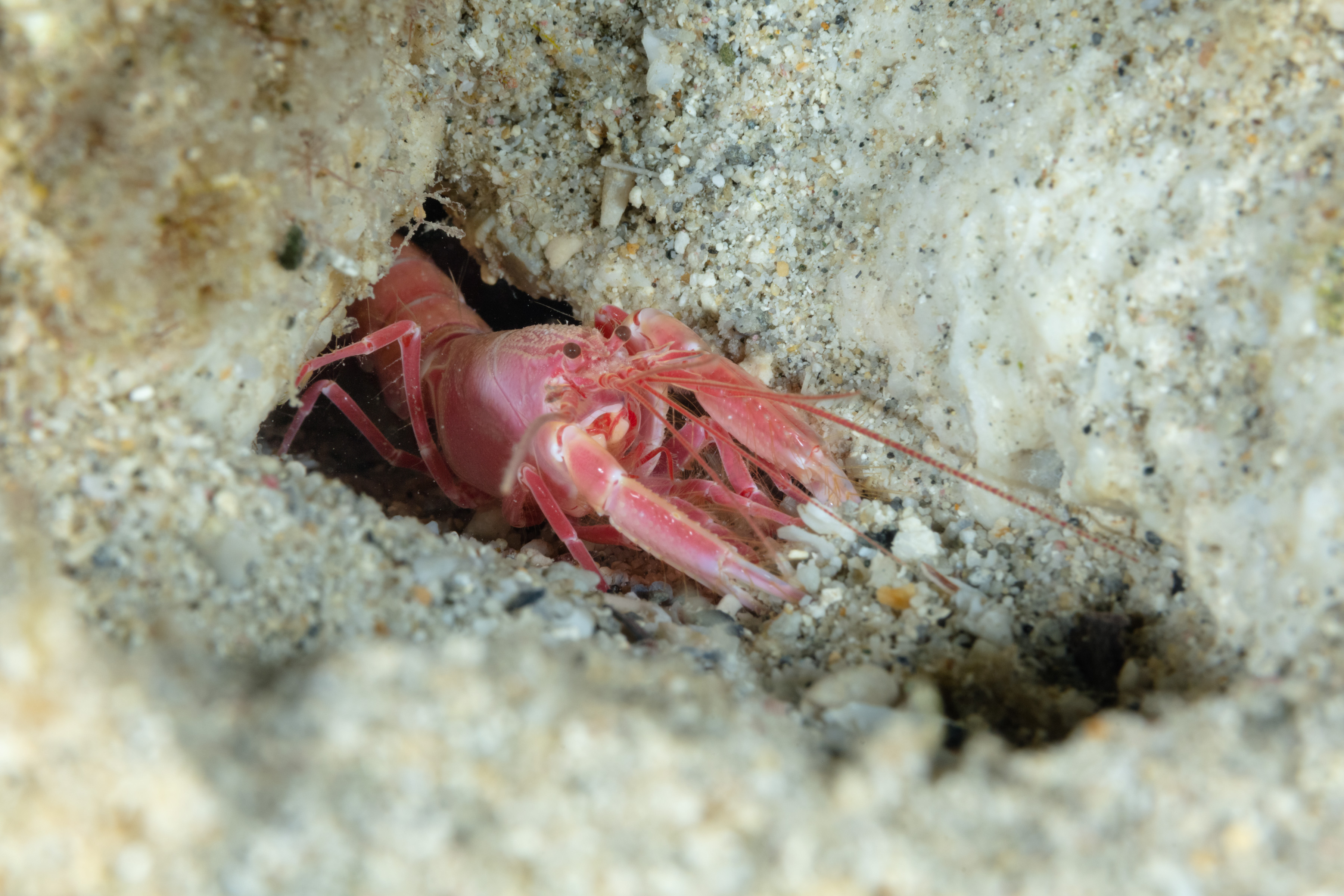 The Serrated Lobster Shrimp lives in burrows within the rubble and sandy areas.