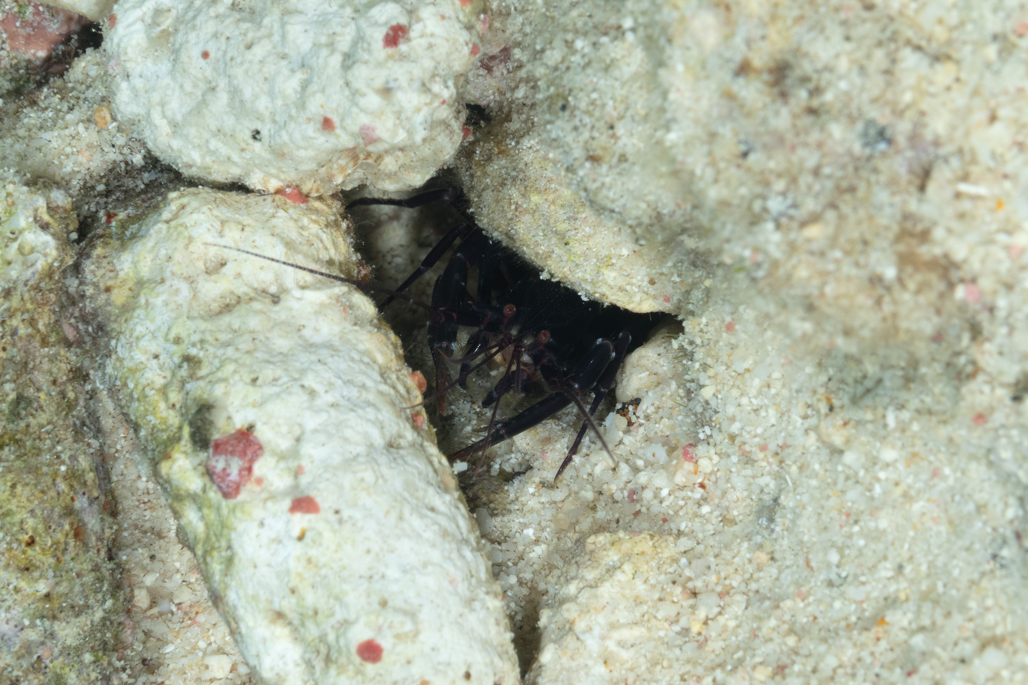 The Serrated Lobster Shrimp lives in burrows within the rubble and sandy areas.