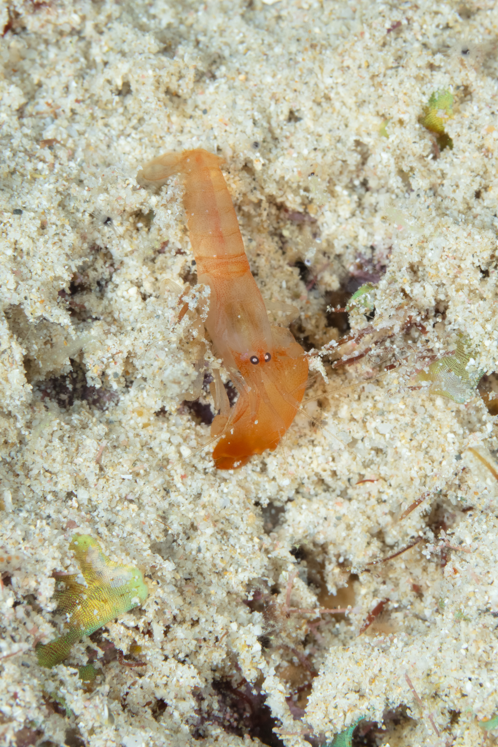 This Snapping Shrimp has a body that is covered in dense reddish-brown or red speckles. Its antennae and walking legs are pale to yellow.