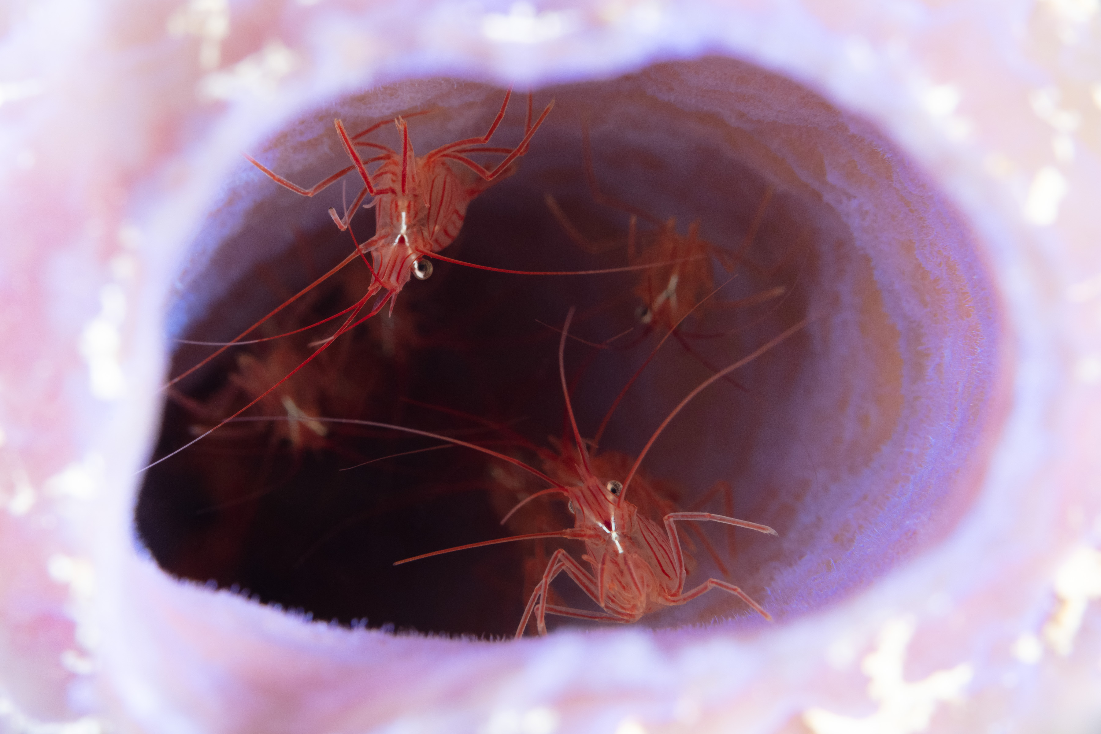 The Sponge Peppermint Shrimp is often found in pairs inside Azure Vase sponges and Elongated Vase Sponges.