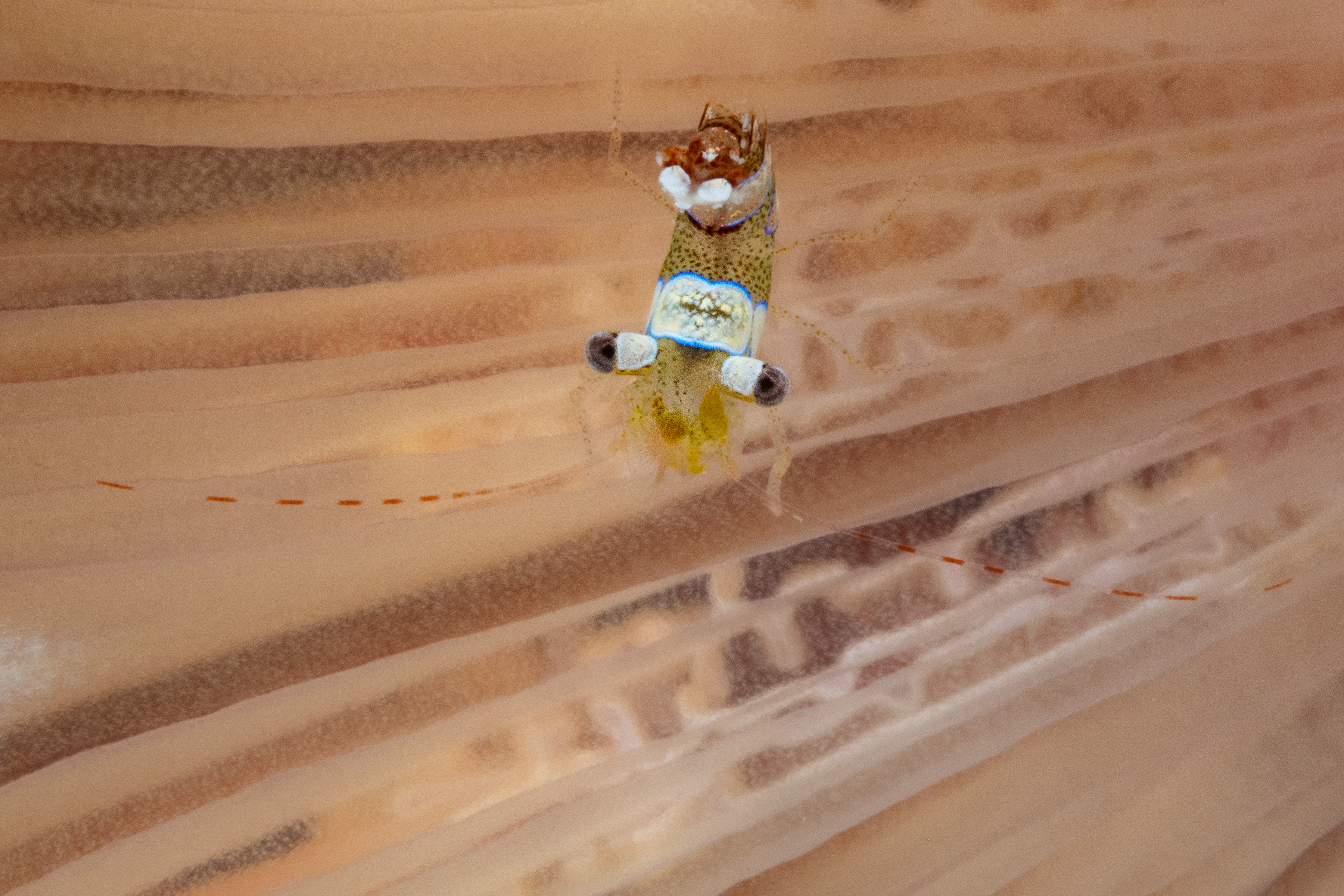 The Squat Anemone Shrimp lives in groups and can be found on Anemones such as the Giant Anemone.
