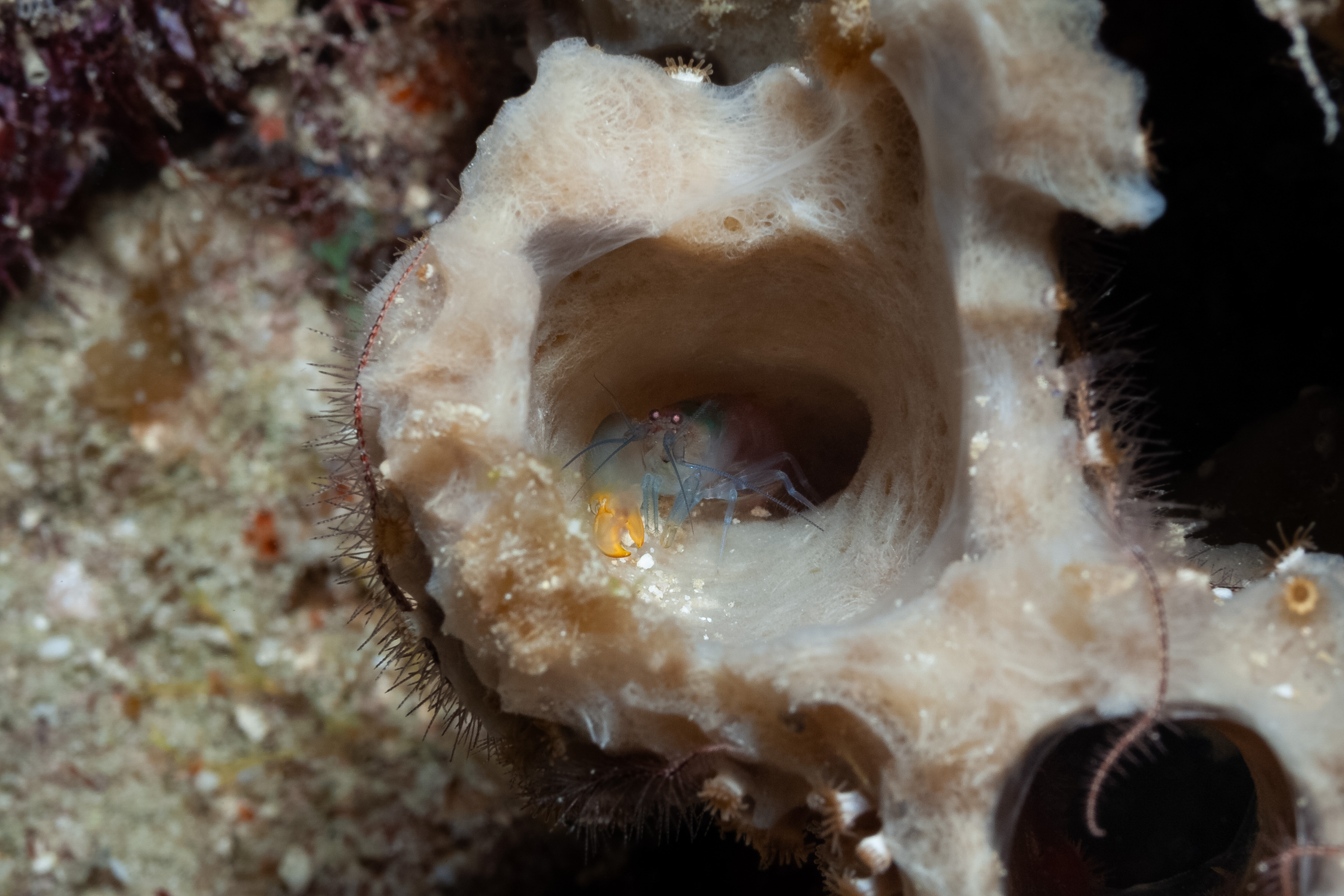 The Stippled Snapping Shrimp lives inside Sponges and is rarely seen outside its shelter.