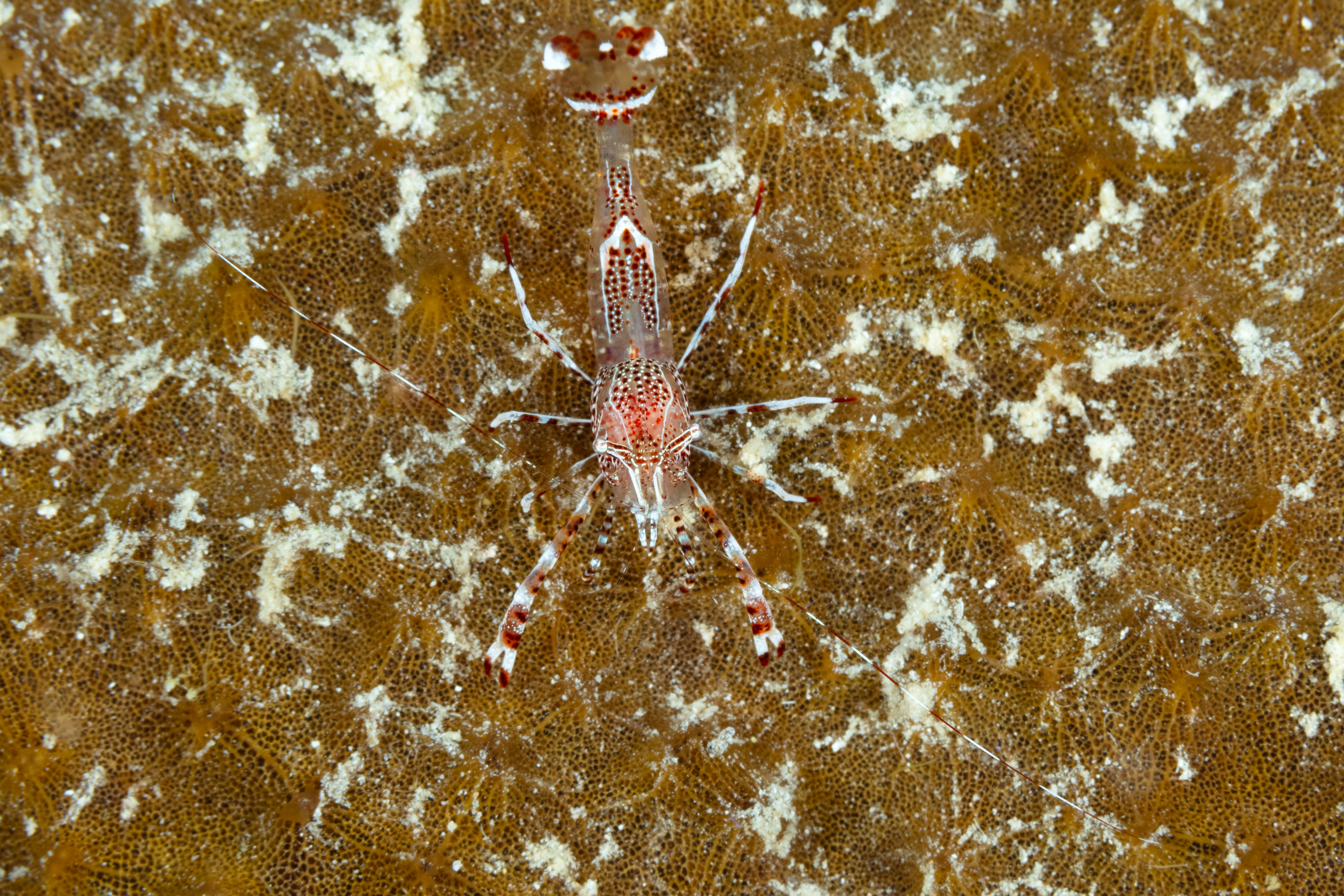 This Shrimp has a transparent body with many brown, white, or red spots. Its back may have detailed patterns and markings.