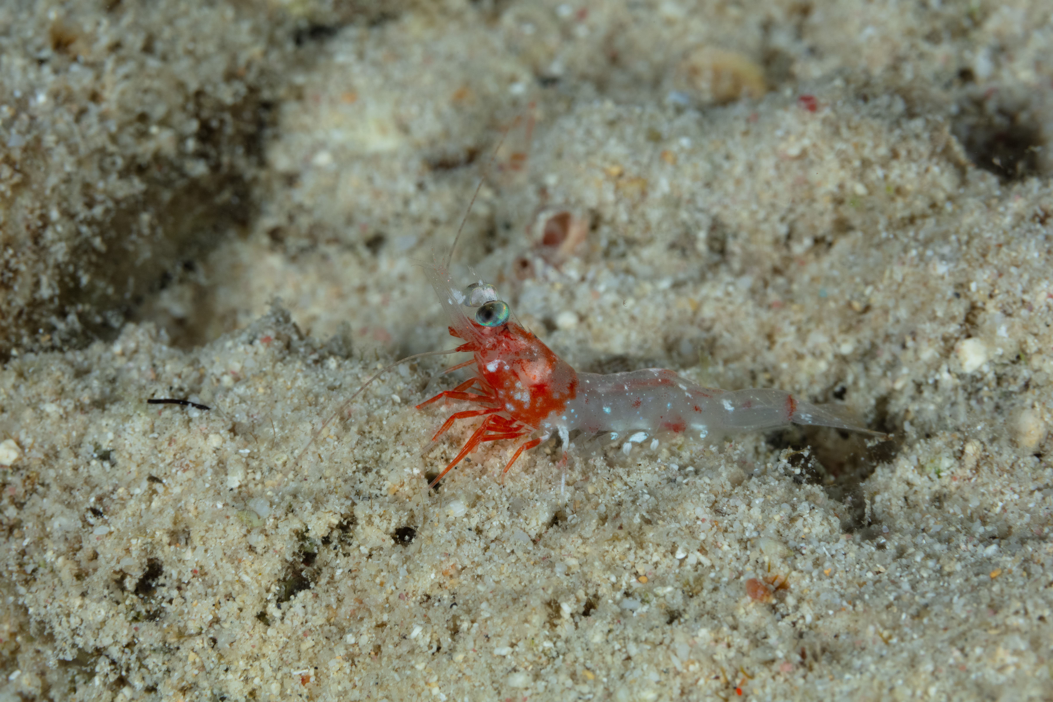 This Shrimp has a long, transparent body with red, brown, or white markings. It has large blue-green eyes and long, thin antennae.
