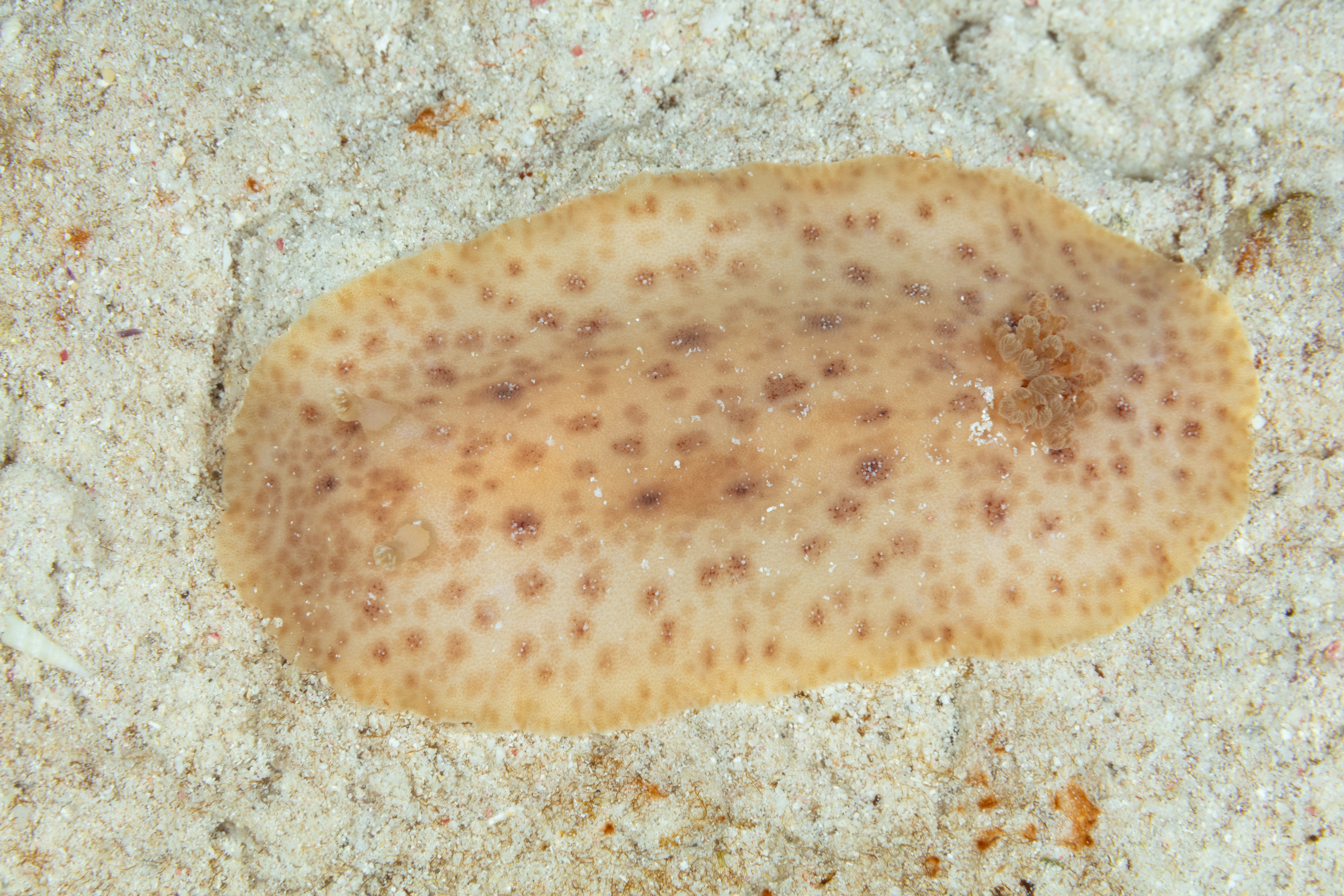 This Nudibranch has a flat, oval shape with a raised center. Its color varies from cream to brown, and it has dark spots.