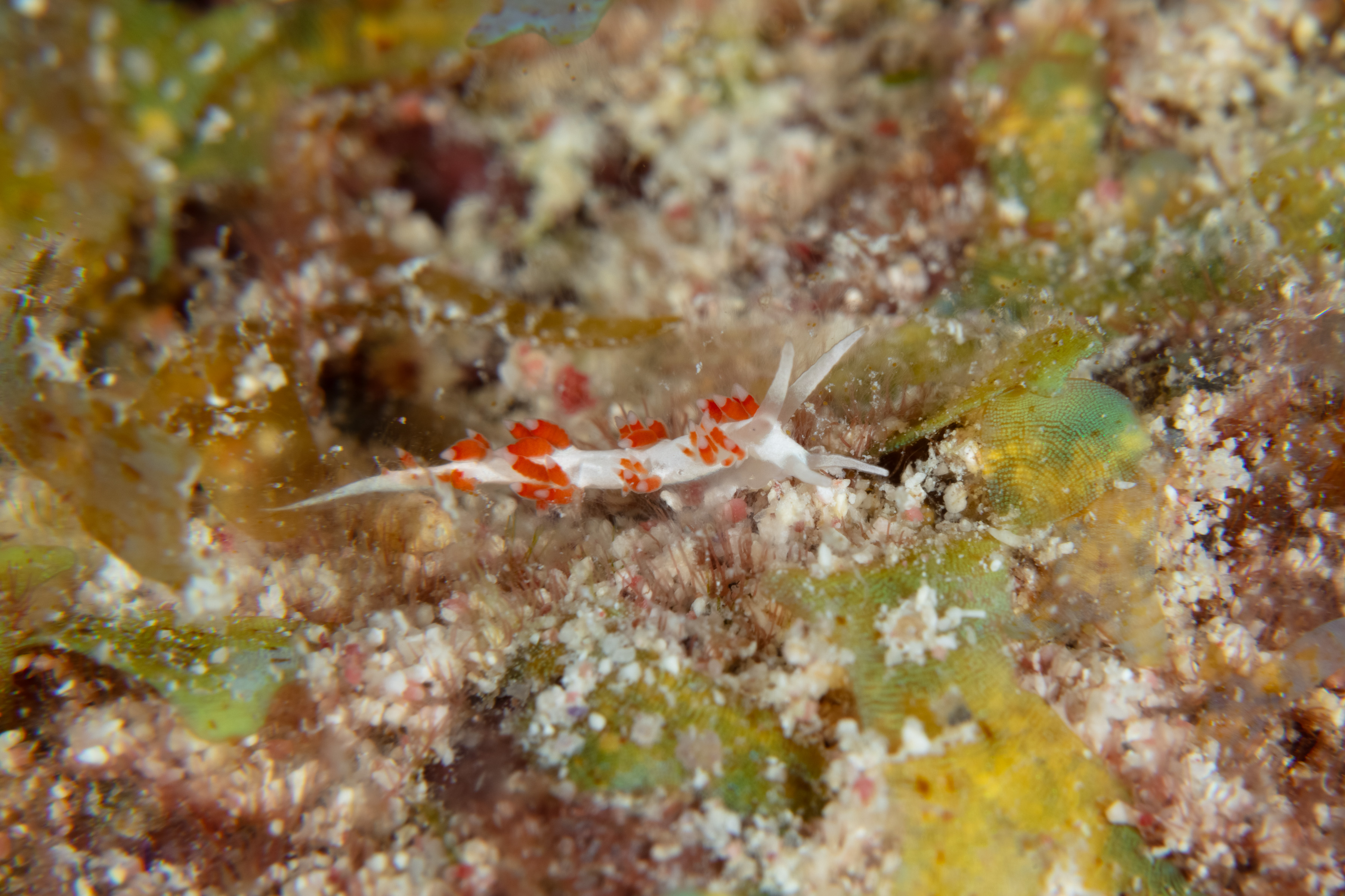This Nudibranch has a white, tapering body with paired clusters of elongated cerata that vary in color. Its white rhinophores and tentacles are smooth.