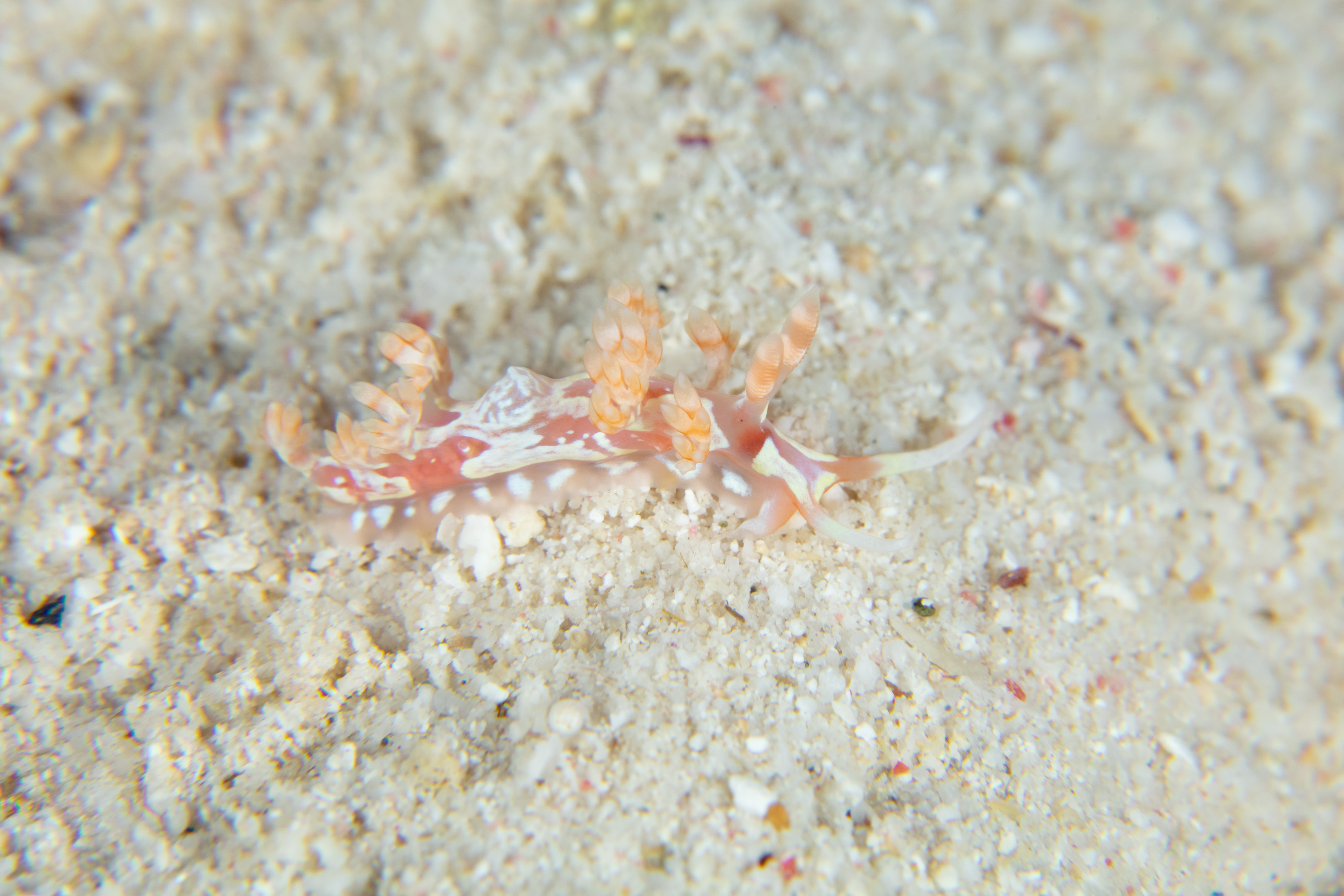This Nudibranch has a thin, tapering body with a detailed white pattern on a purple or orange background. It has orange-banded cerata and rhinophores tipped with white.