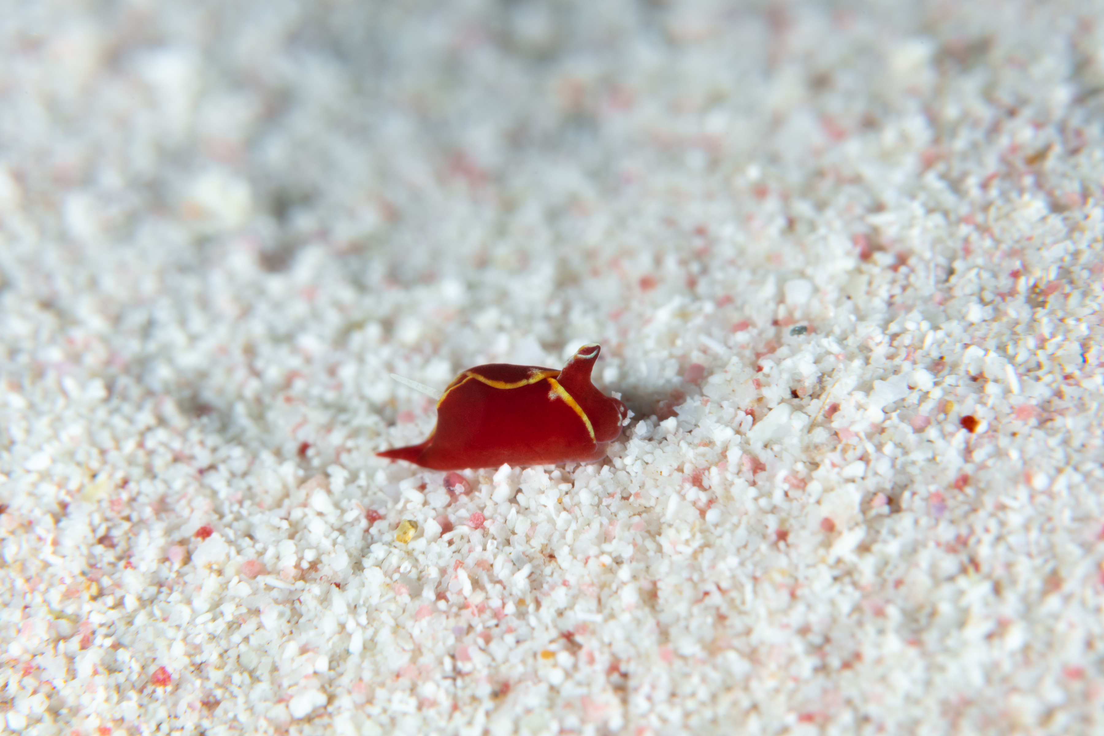 This Bubble Snail has a tiny oval body with overlapping appendages, called parapodia, that are red to black with thin margins. It also has a single siphon curving above the head.