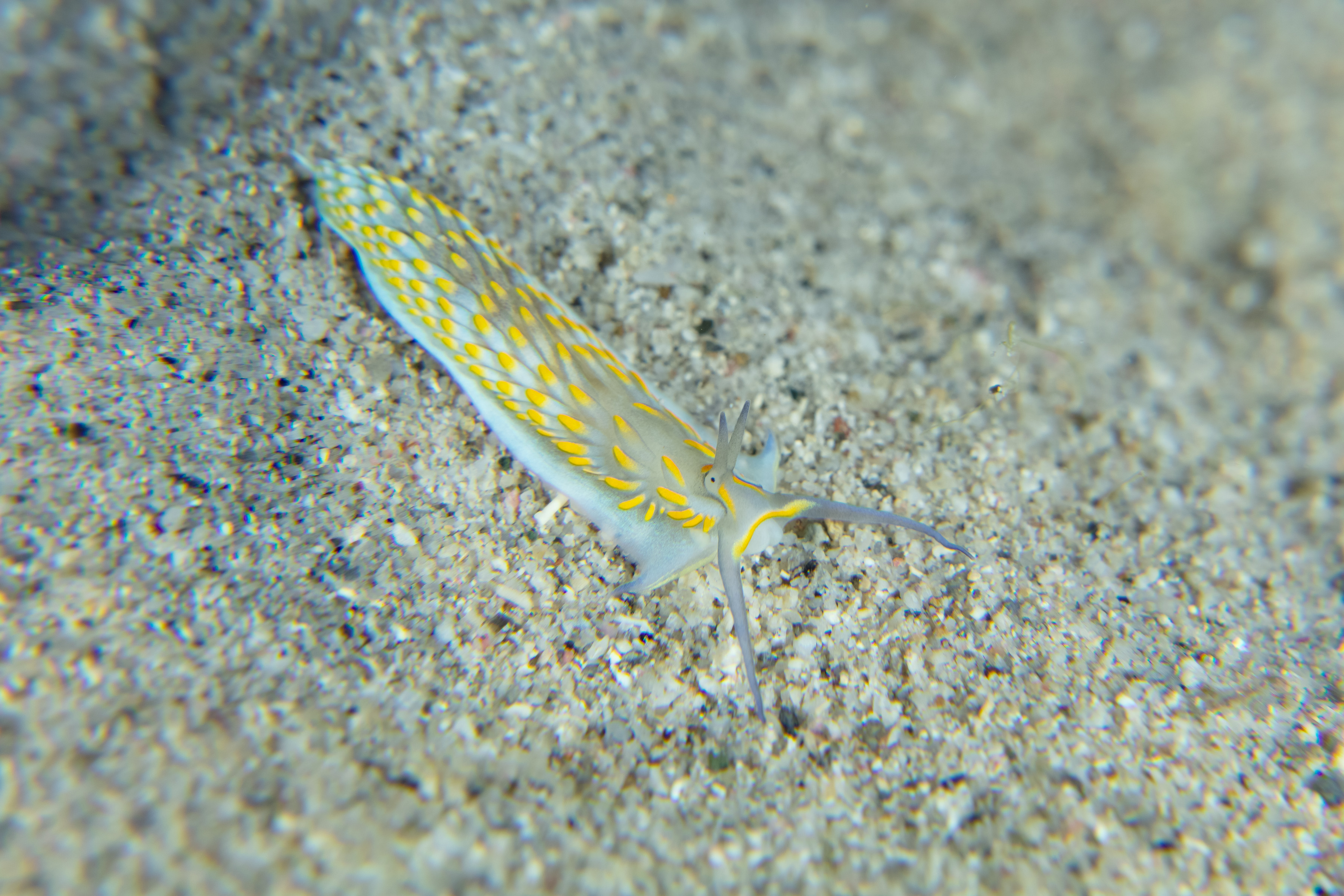 This Nudibranch has a bluish-gray body. The tips of its cerata are Gold-Fringed, highlighted with a gold color, and two yellow-gold lines curve from the rhinophores toward the tentacles.