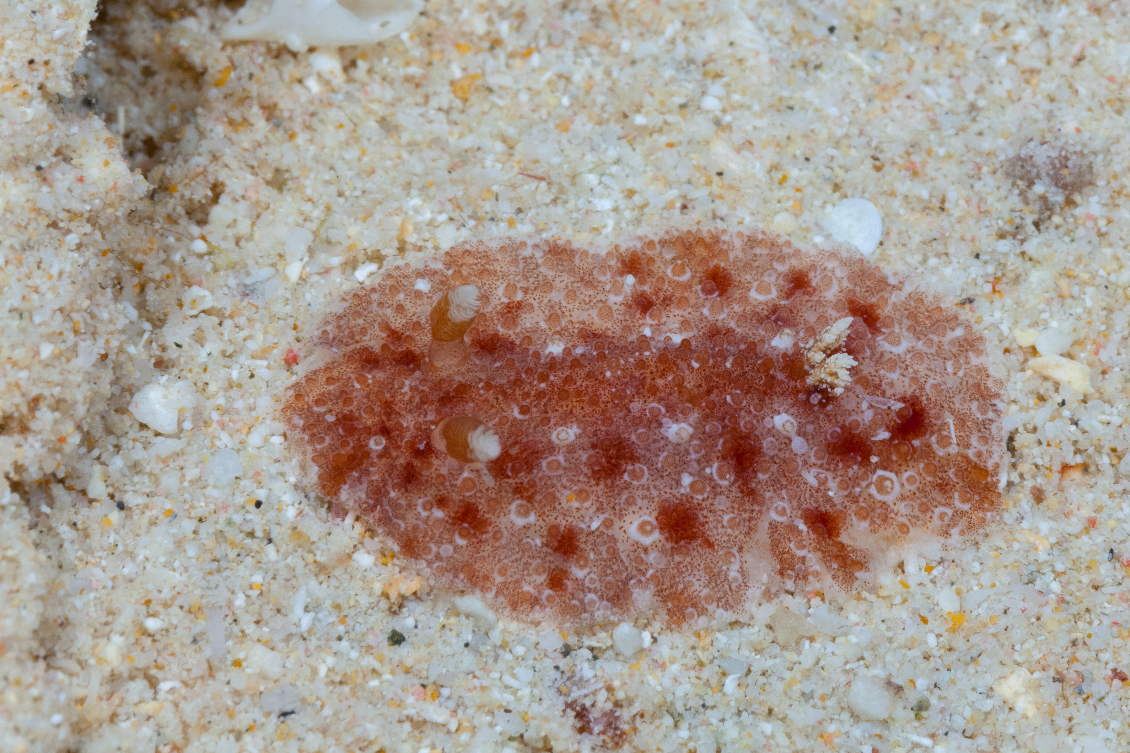 This Nudibranch has a flat, oval body with a raised center. It is covered with small, rounded bumps that are pale-tipped and have white circles at the base. The gill branches are whitish on the outside.