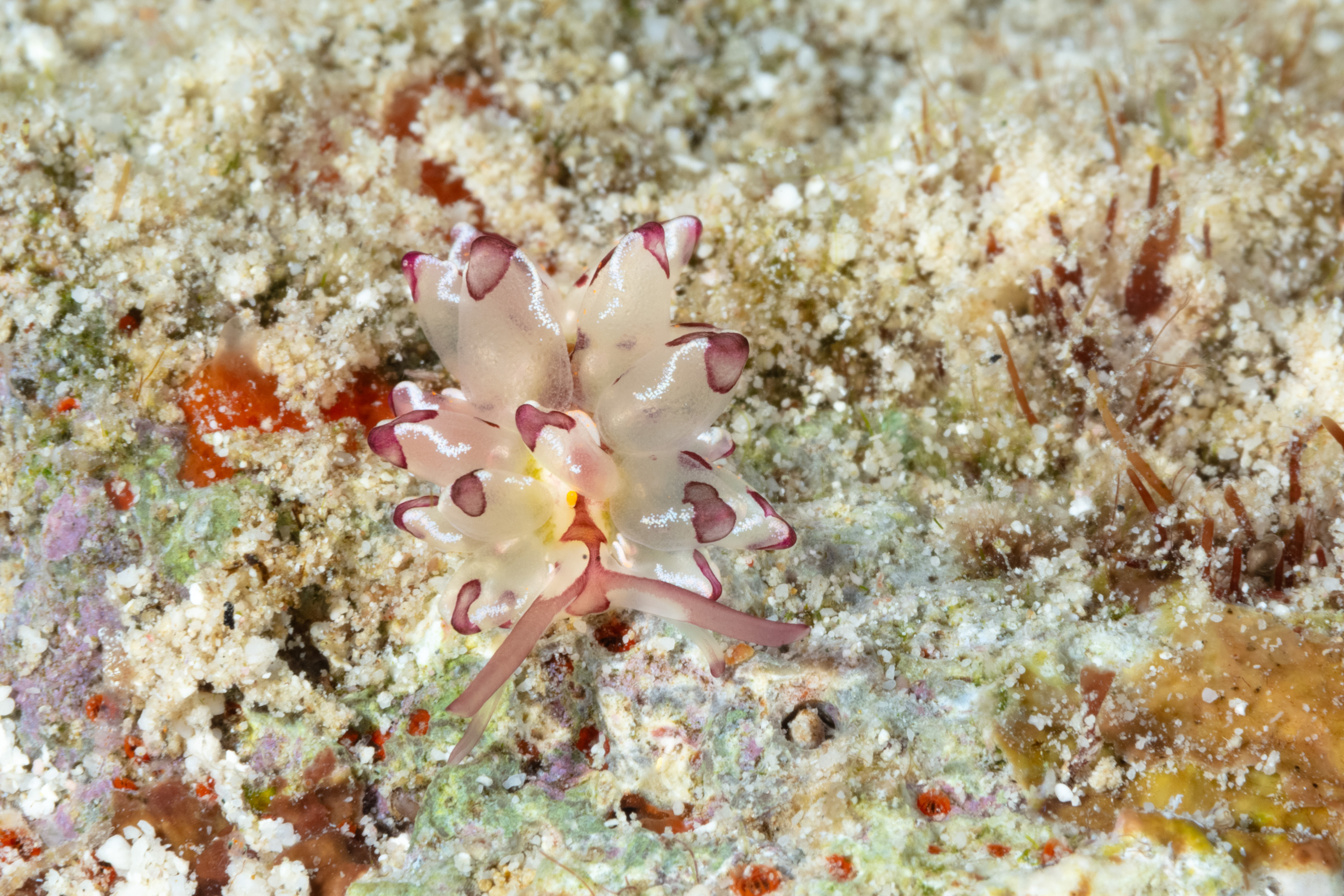 This Glass Slug has a pale body with large, translucent, leaf-like cerata that are tan to dark red at the tips. Its head has close-set dark gray eyes.
