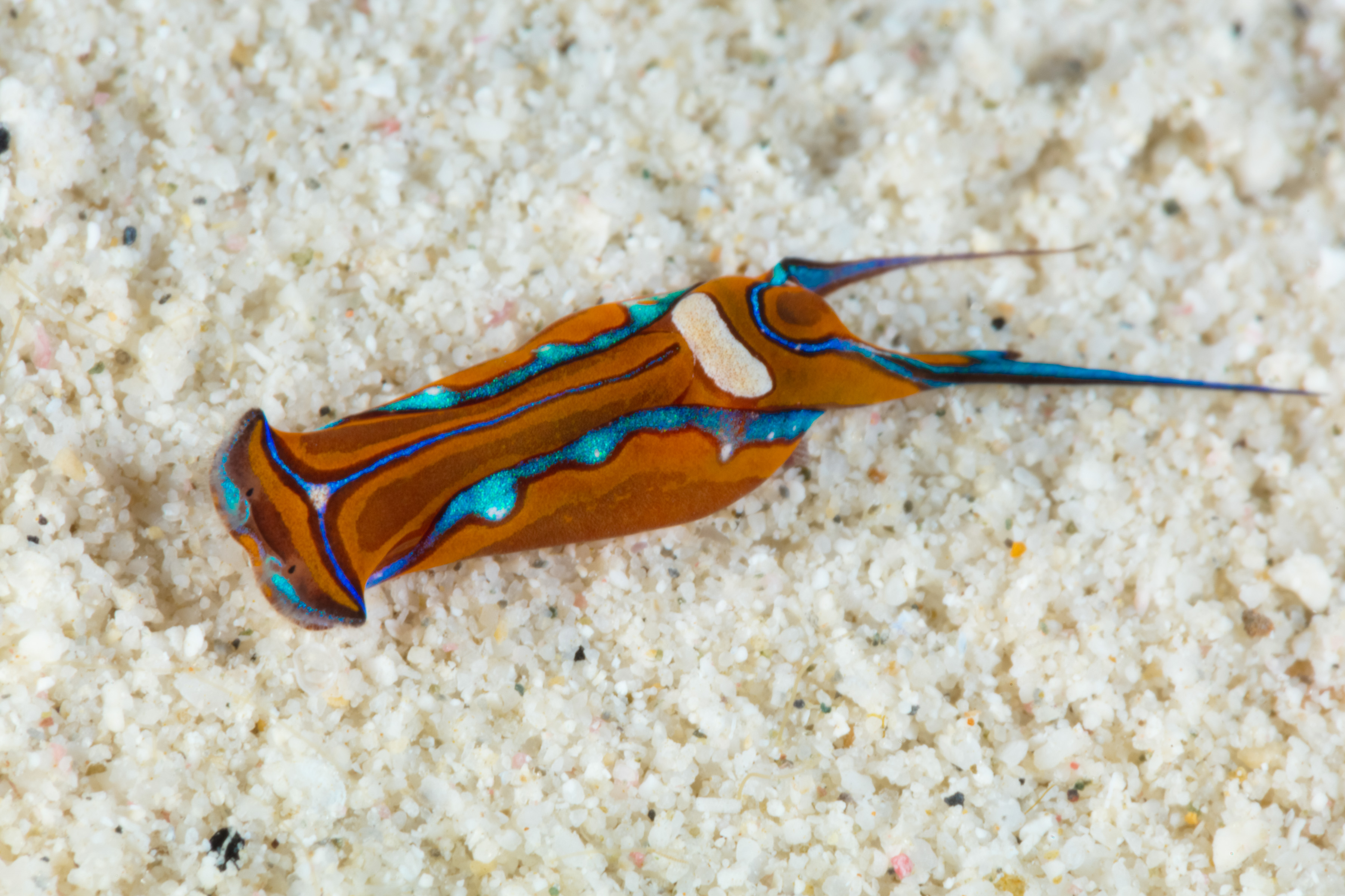 This Headshield Slug has a dark reddish or orange body with two tails of equal length. Blue stripes, outlined in black, run along its body, and a white bar crosses the midsection.
