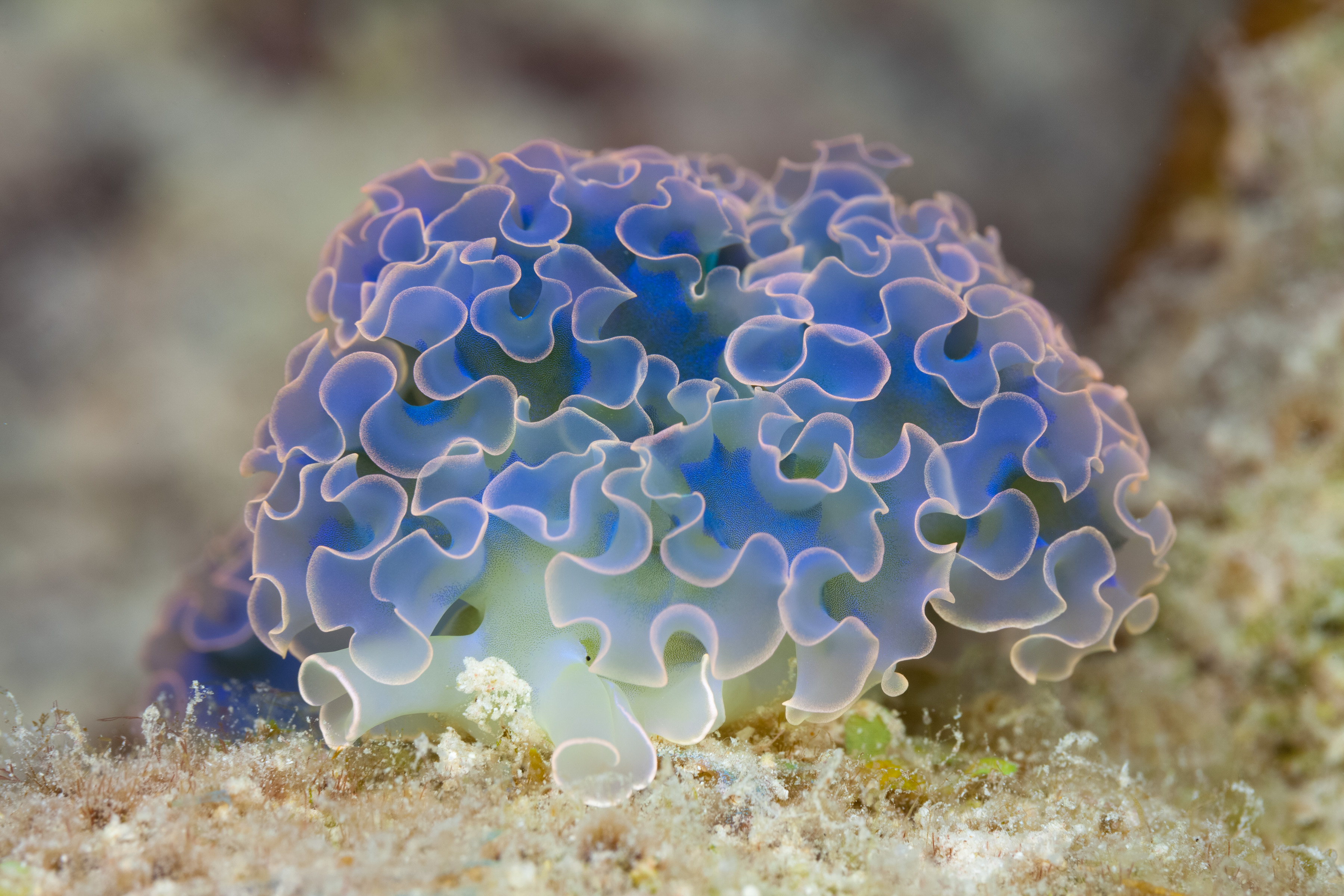 This Sea Slug has skin ruffles that resemble leaf lettuce, with colors that can vary from green to blue and pastel tones. Large pale blotches appear on the mantle, and it has long, curled rhinophores.