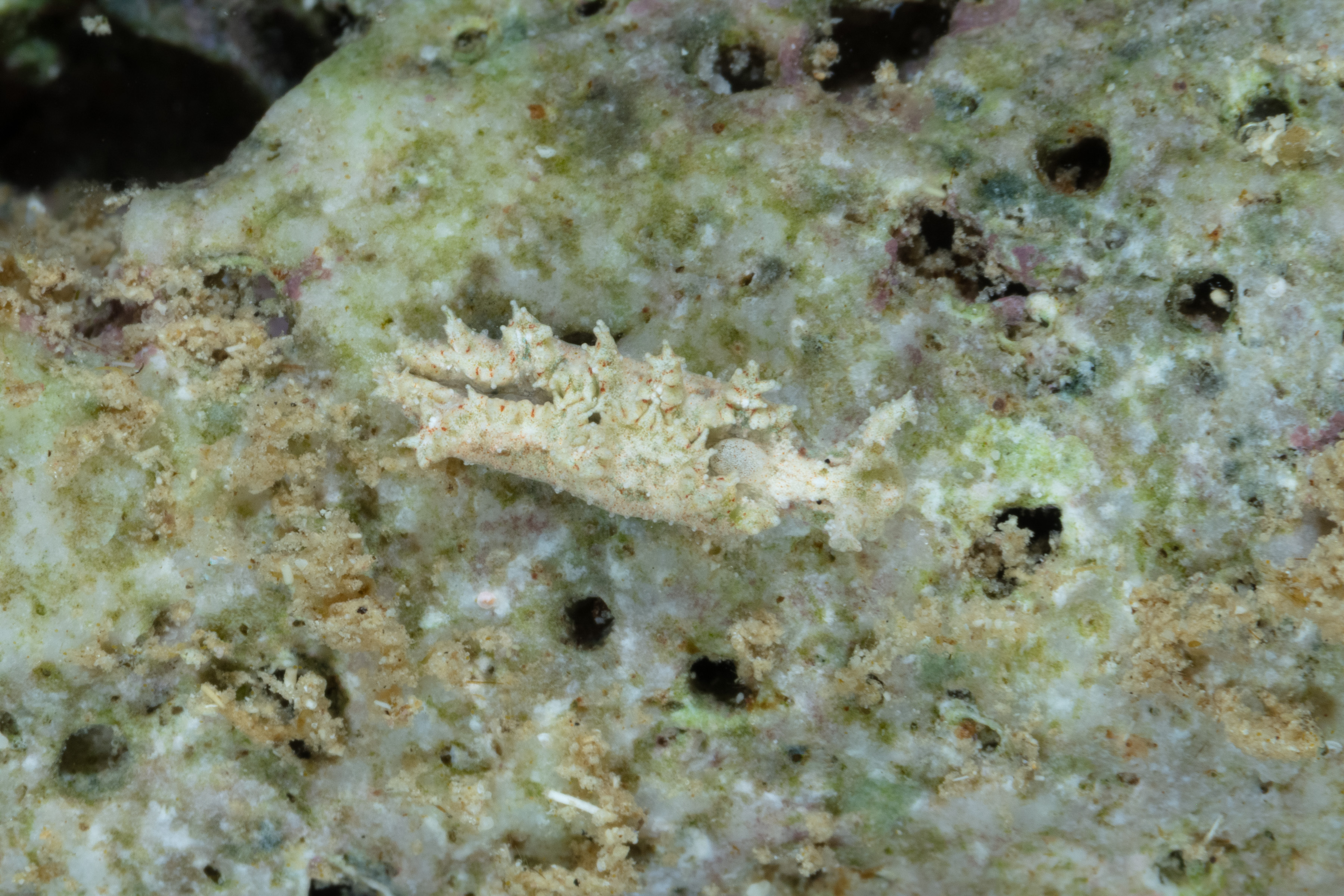 The Papillose Elysia has a long, pale green body with open side flaps edged by a ragged white line of small, cone-shaped bumps scattered over its body.