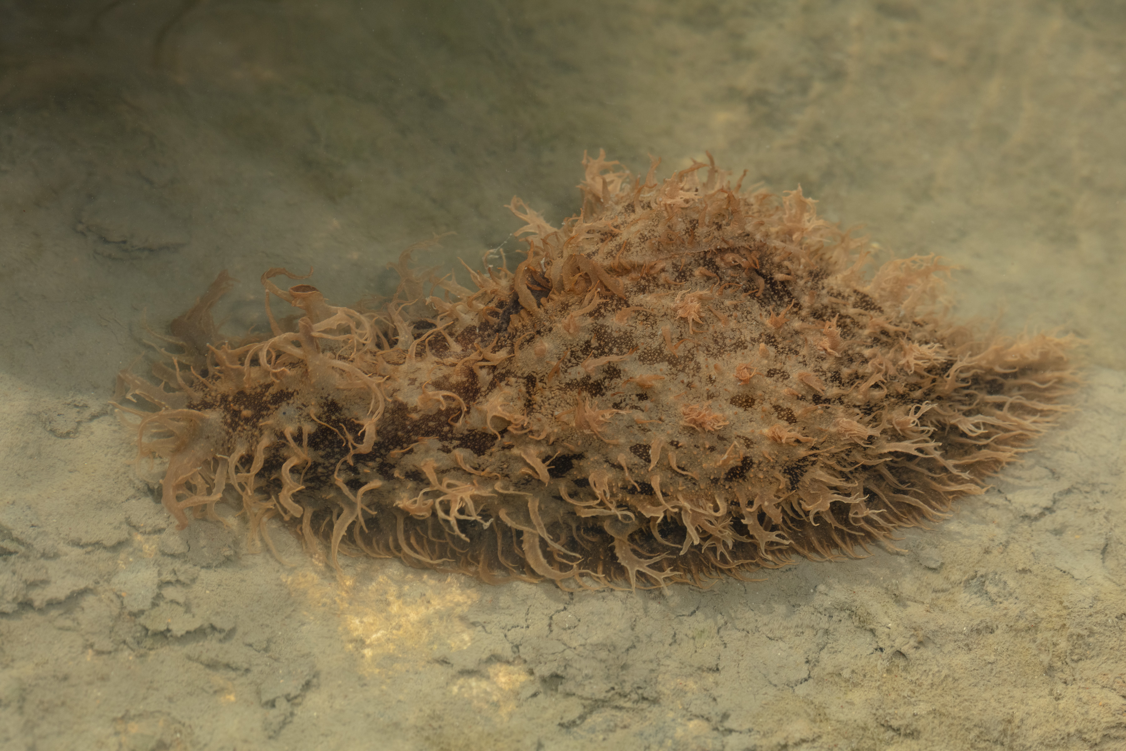 The Ragged Seahare has a brown to tan body with white spots and sometimes blue spots. It is covered in long, thin, branching papillae that give it a shaggy look. Its appearance can vary widely.