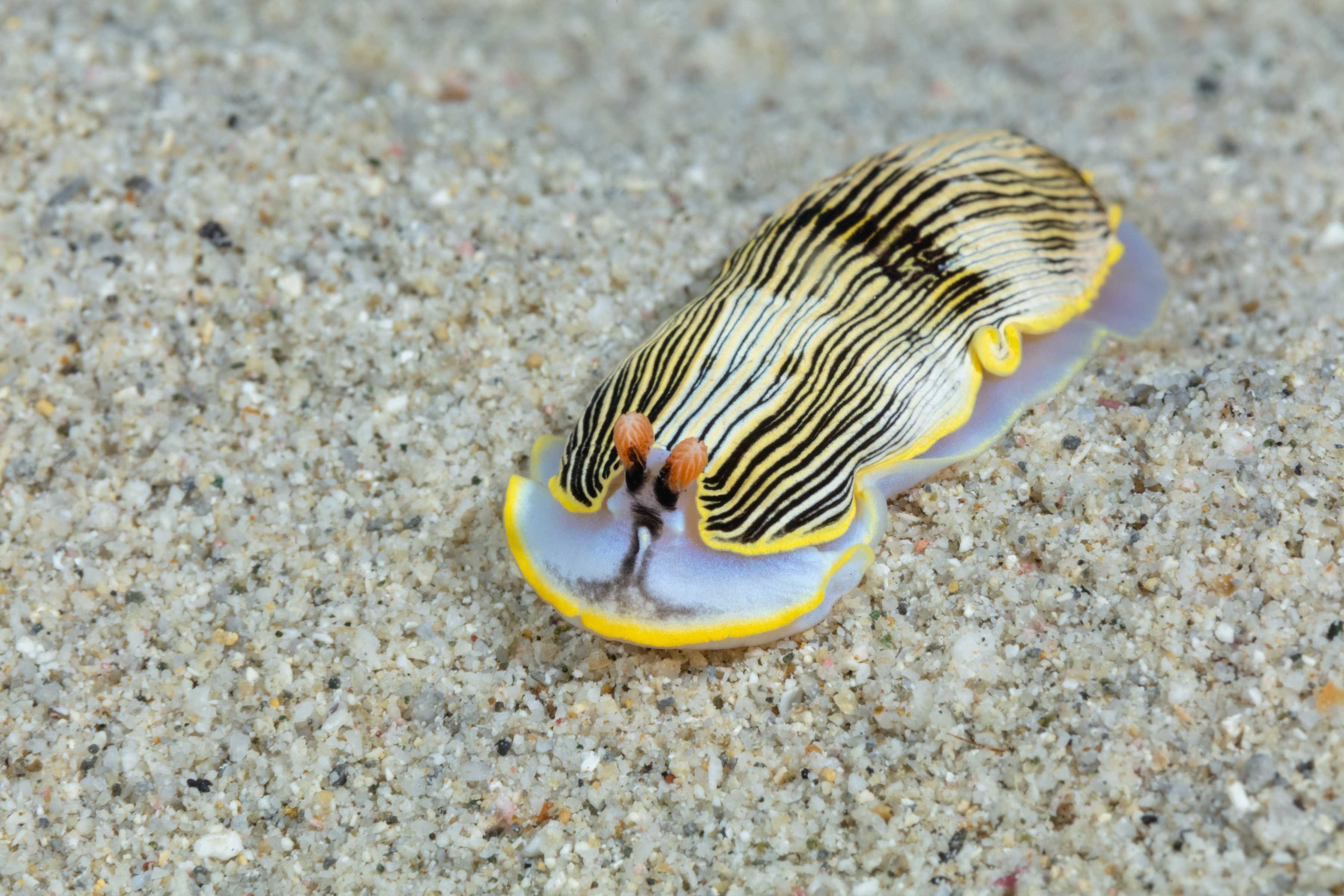 This Armina has a yellow-white body covered in narrow black ridges, with a broad yellow band around the edge of its mantle. It has black markings at the front of its body that can resemble a smile.