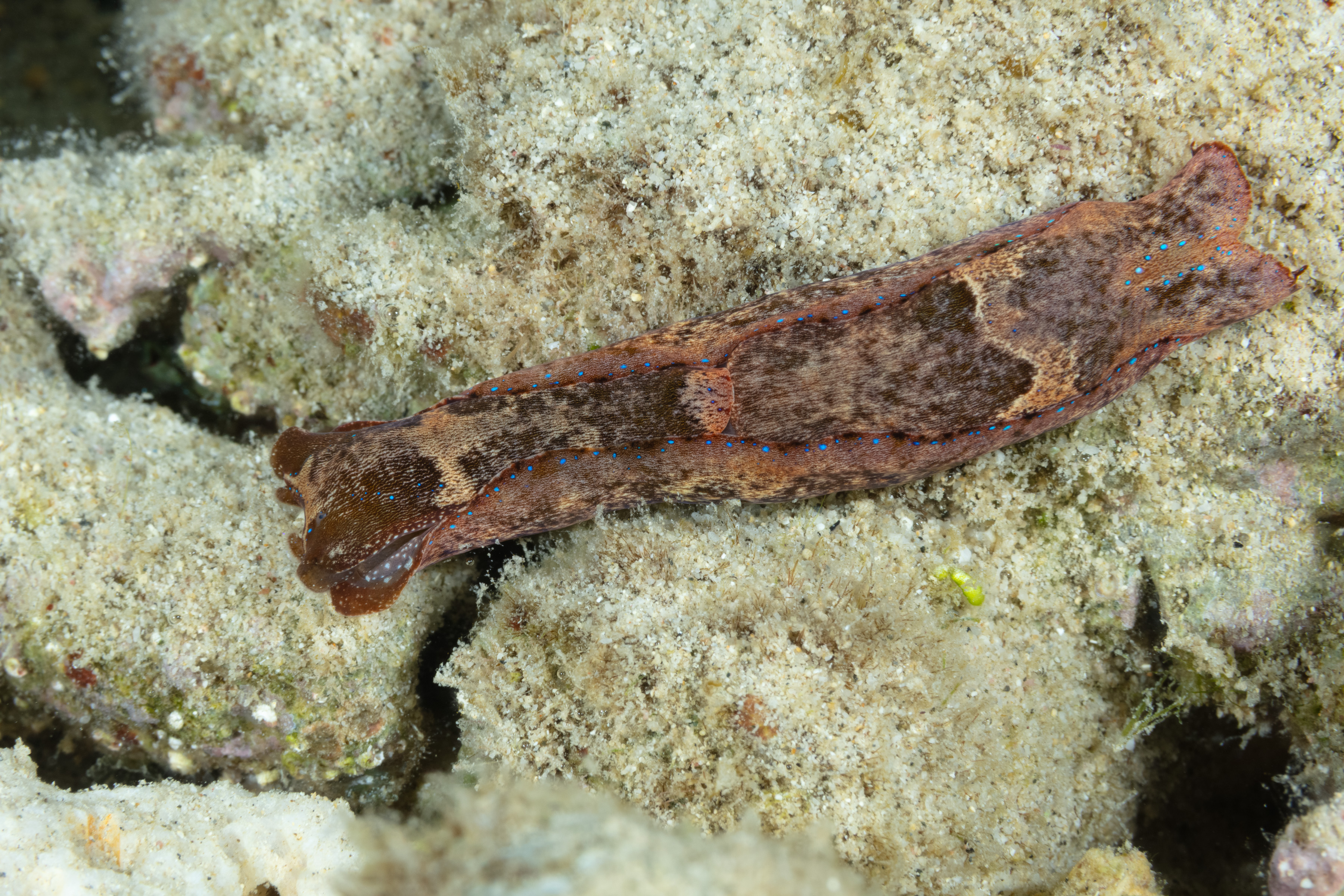 The Striated Aglaja has a large body that varies widely in color, from brown to dark gray or olive, and is covered with fine pale lines or small speckles. It has two side lobes on its head and two matching pointed tails. A visible row of small blue spots runs along the edge of its body flaps.