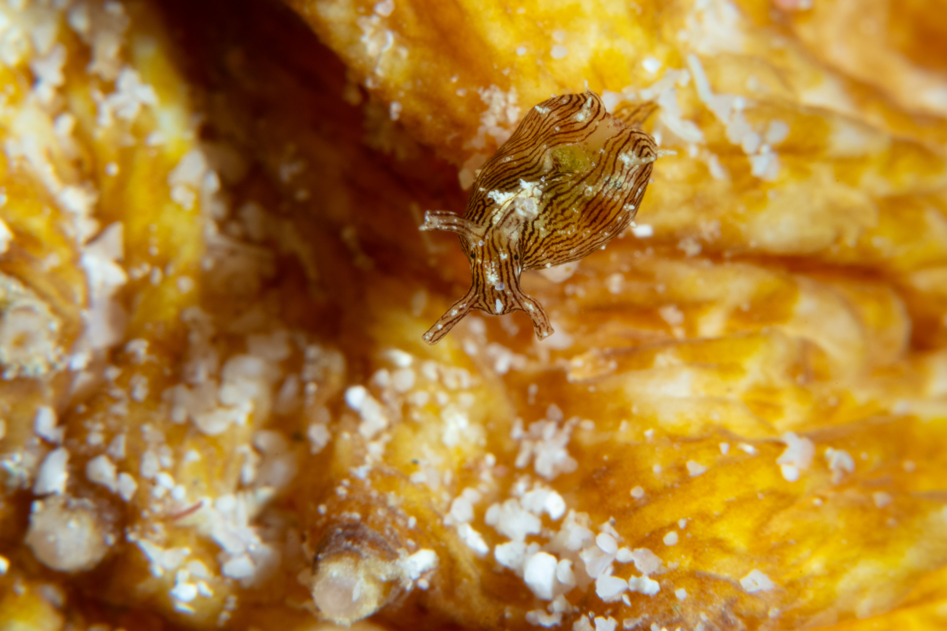 Striated Seahare on a Tiger Tail Sea Cucumber